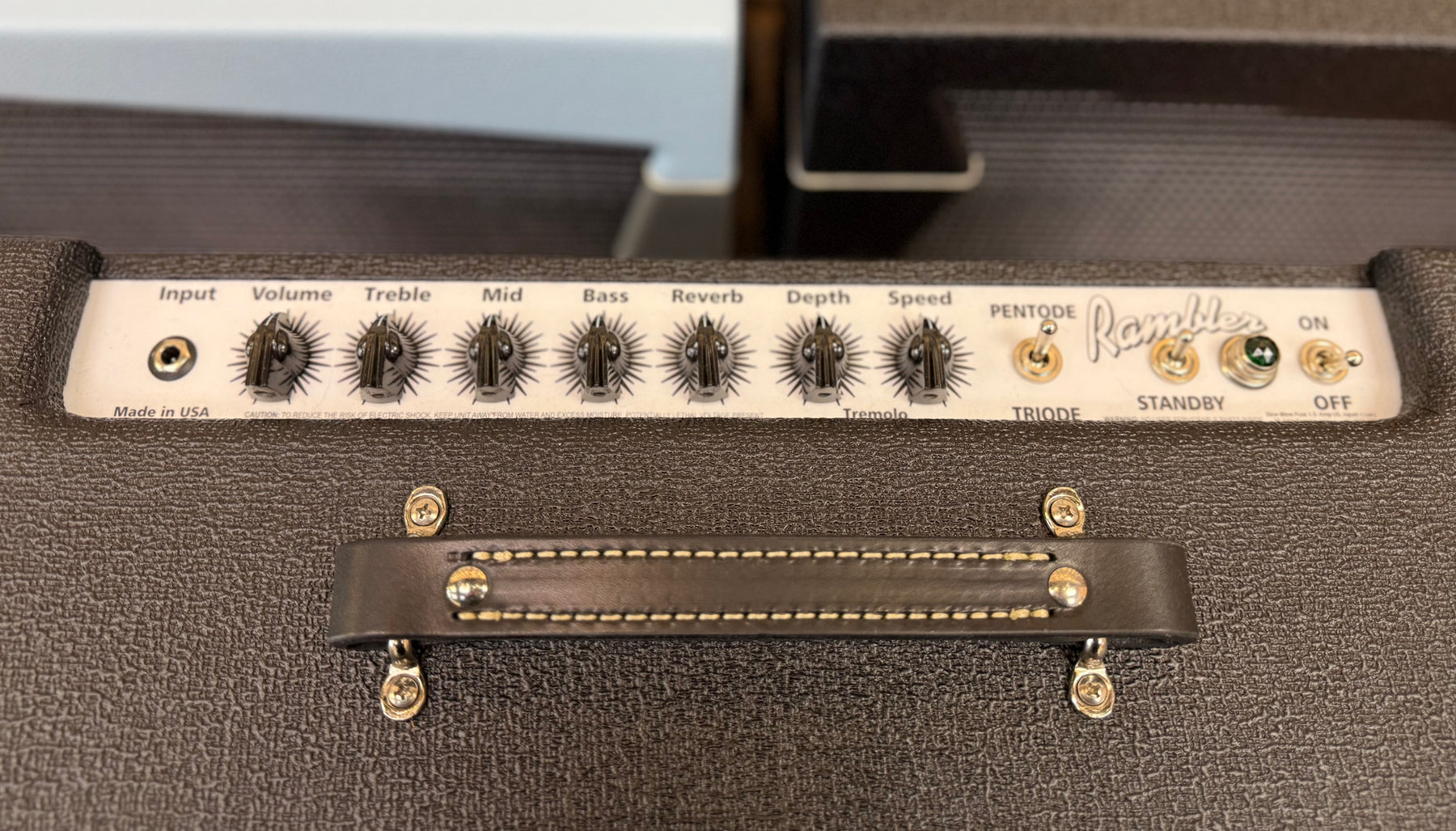 The Rambler also boasts an in-house crafted, dovetail-jointed cabinet made from solid North Carolina yellow pine, with floating speaker baffle for optimal resonance and sonic character. A comfortable, heavy duty leather carrying handle and standard black Tolex covering or a range of custom-color options complete the package."