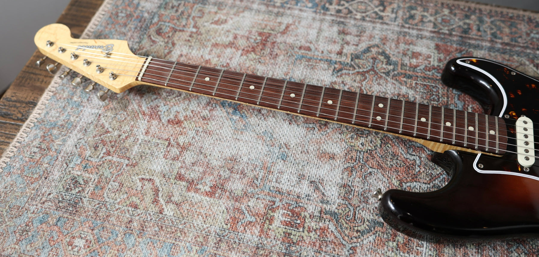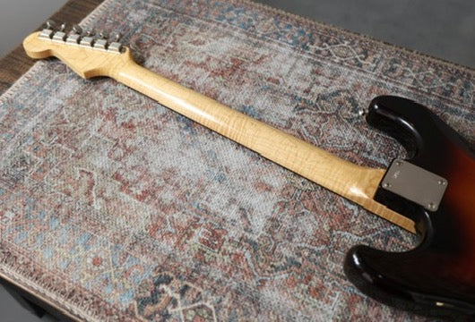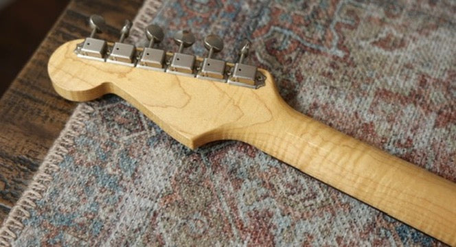 The curly maple neck immediately stands out—both visually and sonically—paired with a round-lam Amazon rosewood fingerboard carved to a Chunky “C” profile inspired by early pre-CBS Fender necks. With measurements of .84” at the 1st fret and .98” at the 12th, plus a 9.5" radius and 1 5/8" bone nut, the neck blends vintage substance with modern playability. Jescar 51100 fretwire enhances articulation and adds to the guitar’s smooth, high-end feel. At 7lbs 3.6oz, the instrument is notably comfortable and impeccably balanced.