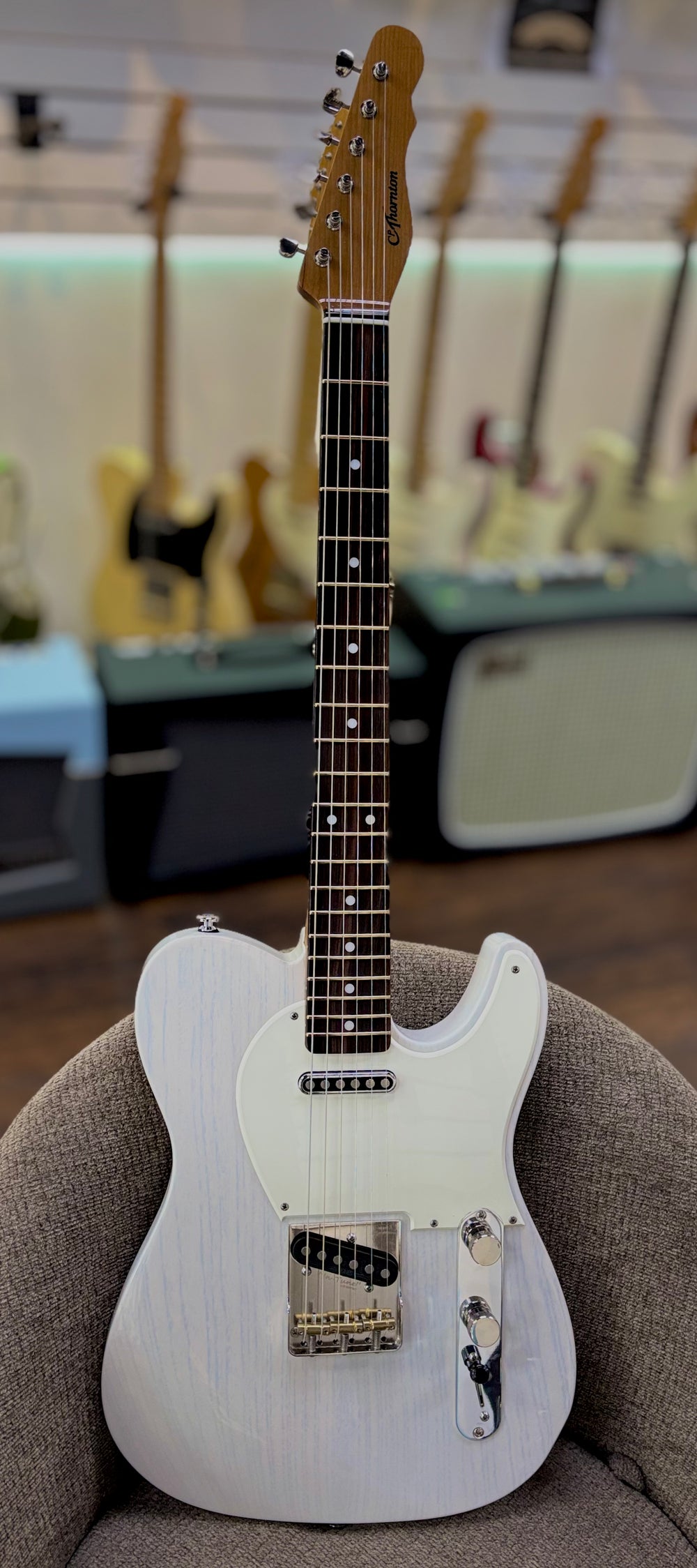 Collector owned. This guitars in min condition Crafted with exquisite attention to detail, this Classic II in White Blonde captures the essence of a vintage T-style while elevating it with Chuck Thornton’s renowned craftsmanship. The swamp ash body shows beautifully under the translucent white blonde finish, enhanced to reveal subtle streaks and grain that give this guitar a unique character on stage or in the studio.