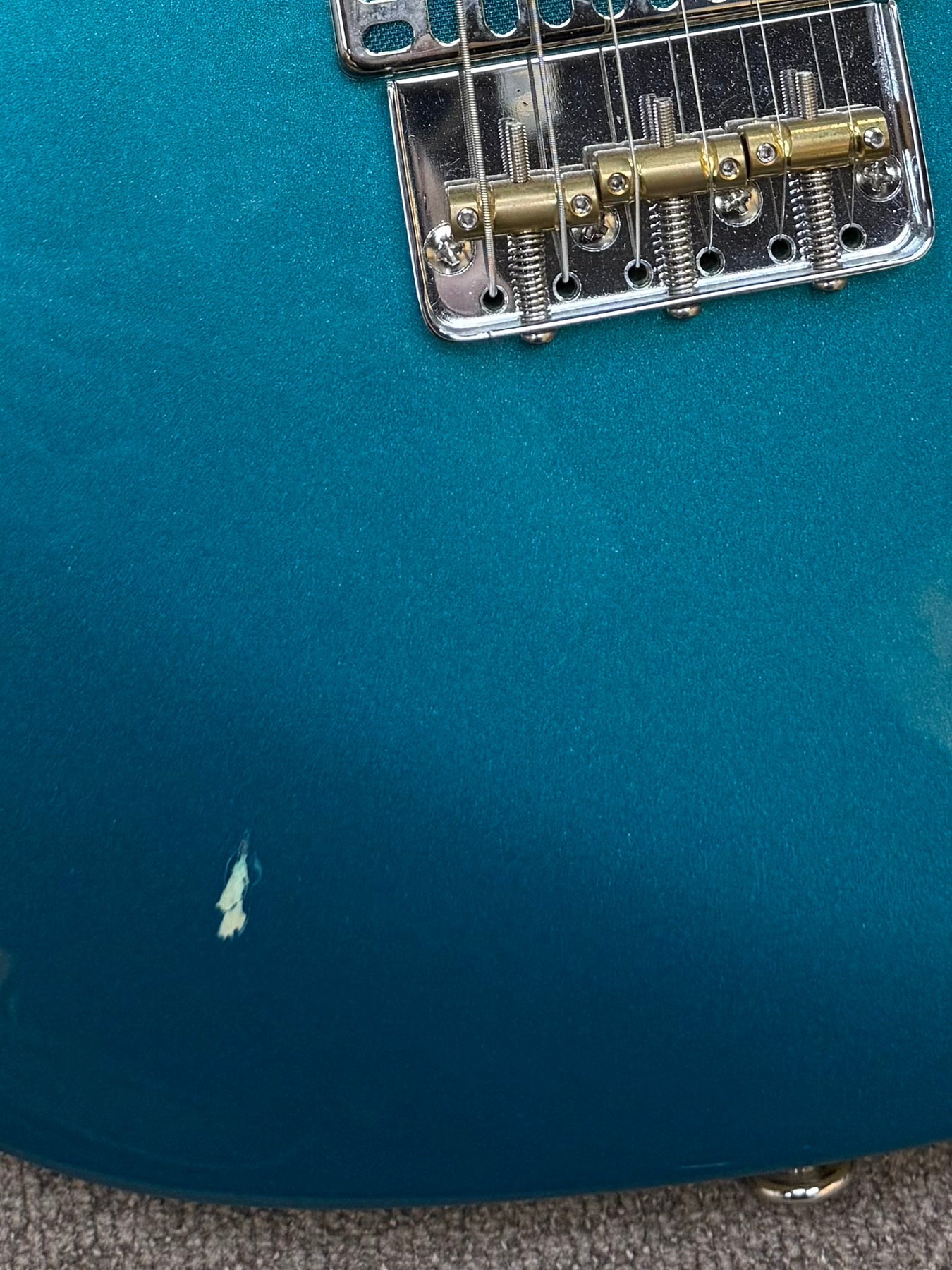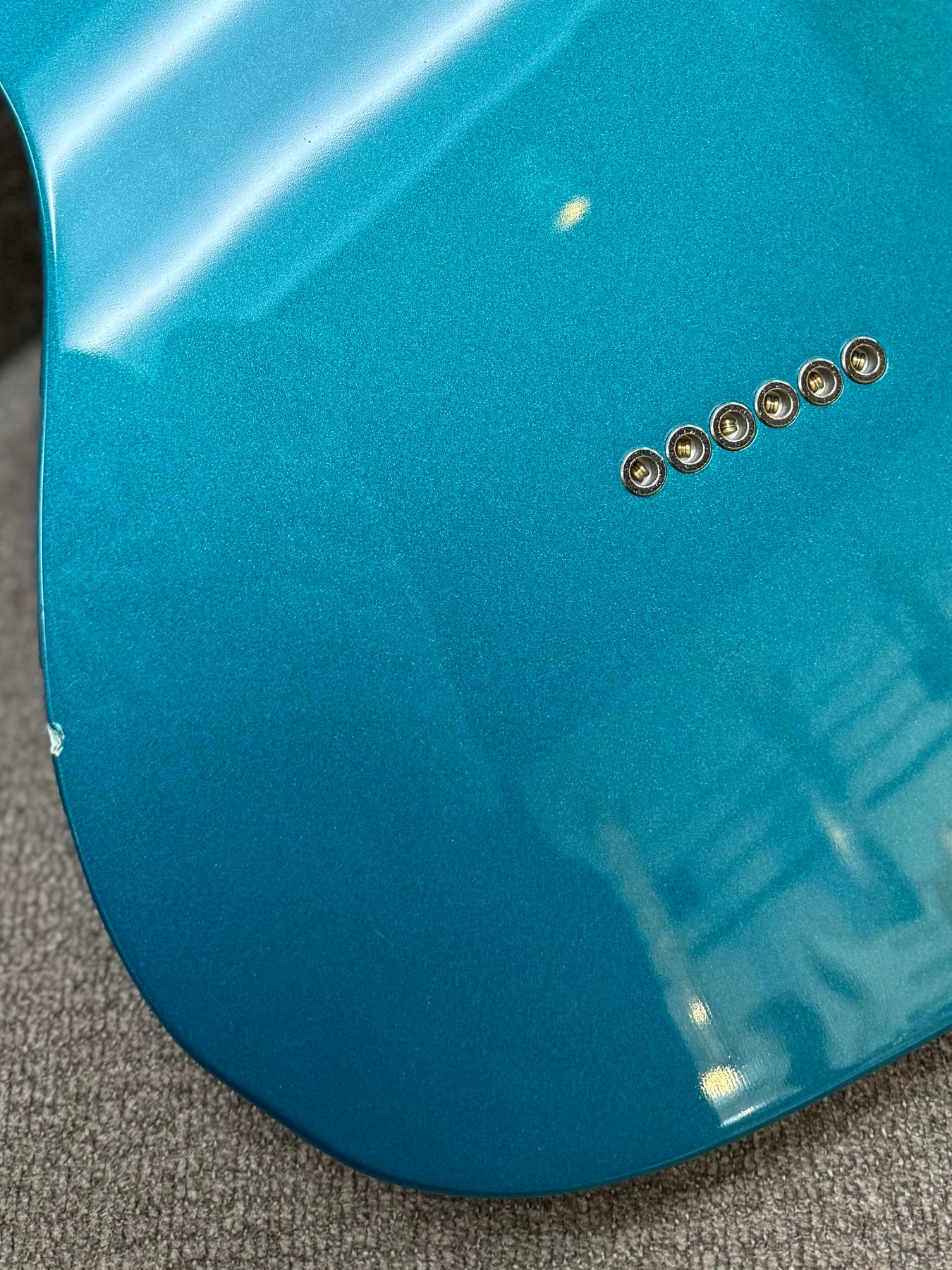 • Old Growth Nutka Cedar Body (900+ years old) • Hot Rod Teal Metallic / Cream Finish (Nitro lacquer) • 25.5" Scale Length • 1.67" Bone Nut • Torrefied 5A Flame Rock Maple Neck w/ Rosewood Fingerboard & 10” radius (Matte lacquer neck finish) • Neck Profile Med C .083" -.090" • 1-Ply Cream Guard • Evo Gold Fret-Wire, Width 0.92" x Crown Height .048" (slightly shorter than 6105 wire) • Matching Headstock • Gotoh Tuners, Staggered • Gotoh Half Tele Bridge w/ Brass Compensated Saddles • Reversed Control Plate / Slanted 3-way Blade Switch • Bare Knuckle low-friction Pots & Cap (push-pull on tone pot) • Mojo UK Dual Foil pickups w/ matching teal foil mesh (simultaneously splitable via tone-control push-pull pot) • Weight 6lbs 7oz • Access III HSC & COA included.