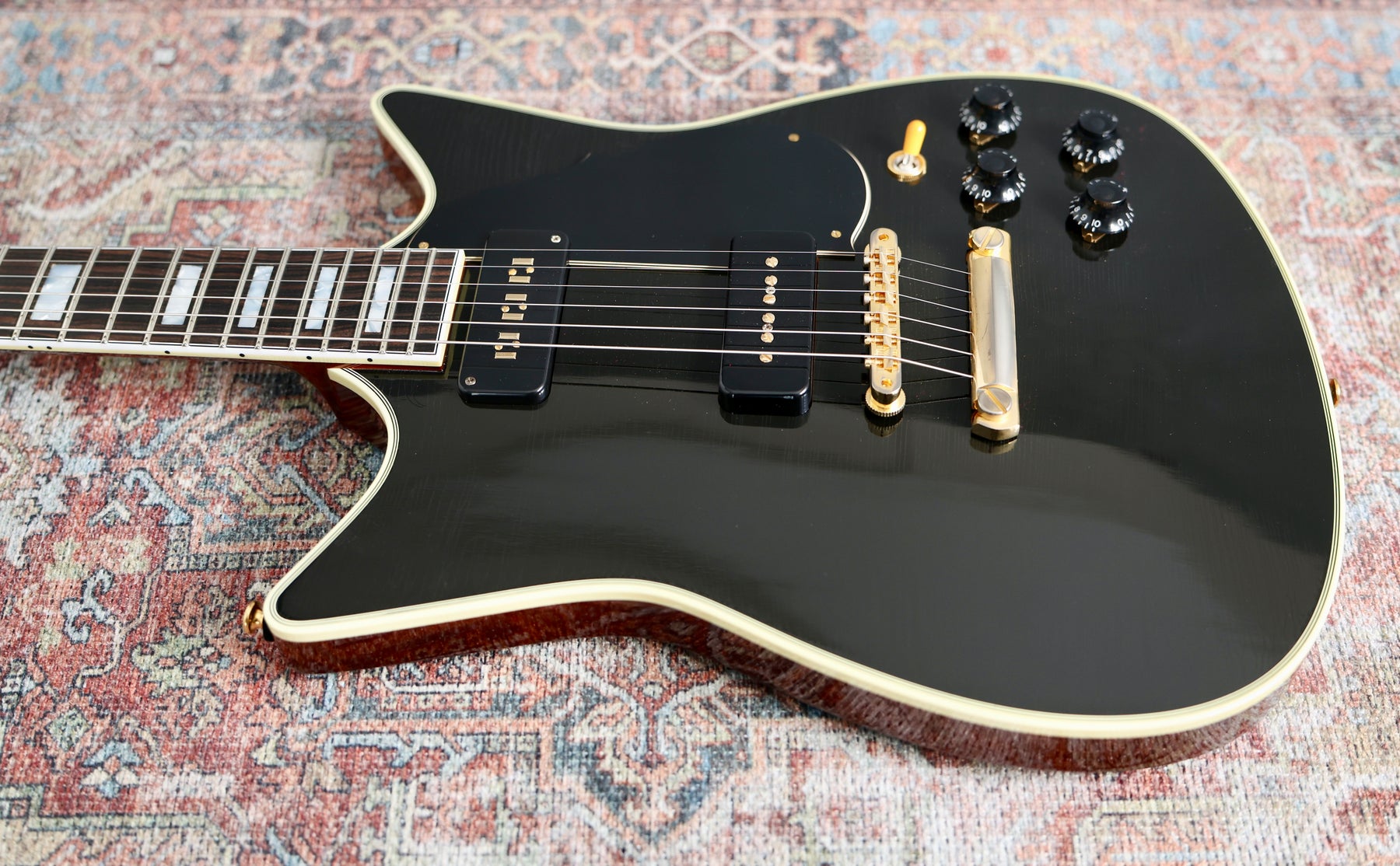Electronics are handled by a pair of Seymour Duncan P90s, with a Custom Shop Staple P90 in the neck and an Antiquity Soapbar P90 in the bridge. This combination delivers articulate, dynamic cleans and rich, harmonically complex overdrive, with excellent responsiveness to pick attack and volume control changes. A traditional four-knob layout with a three-way toggle keeps the controls familiar and intuitive.