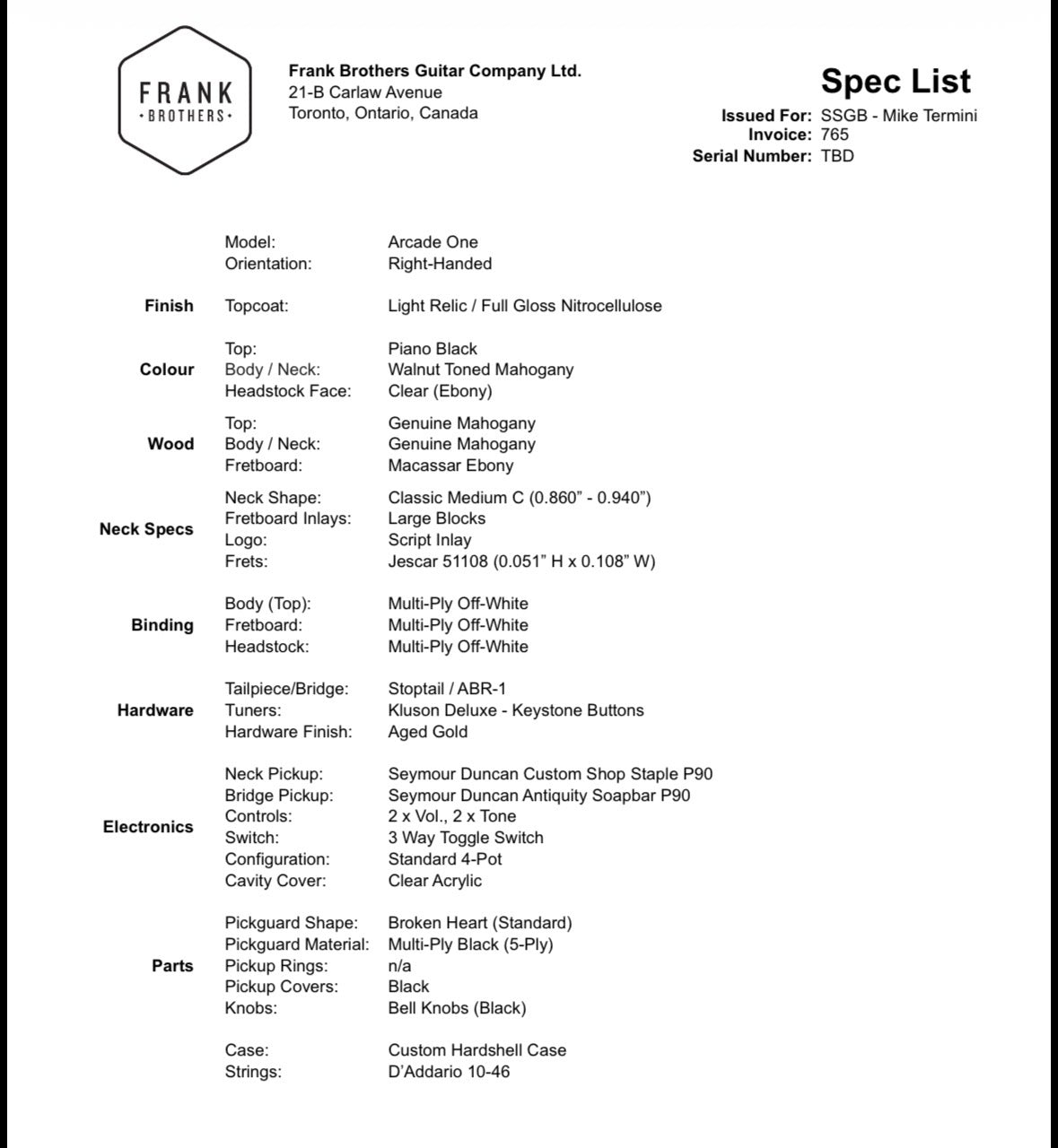 Frank Brothers Guitar Company - CUSTOM ARCADE ONE MODEL. Piano Black. 2026 / NEW (Authorized Dealer)