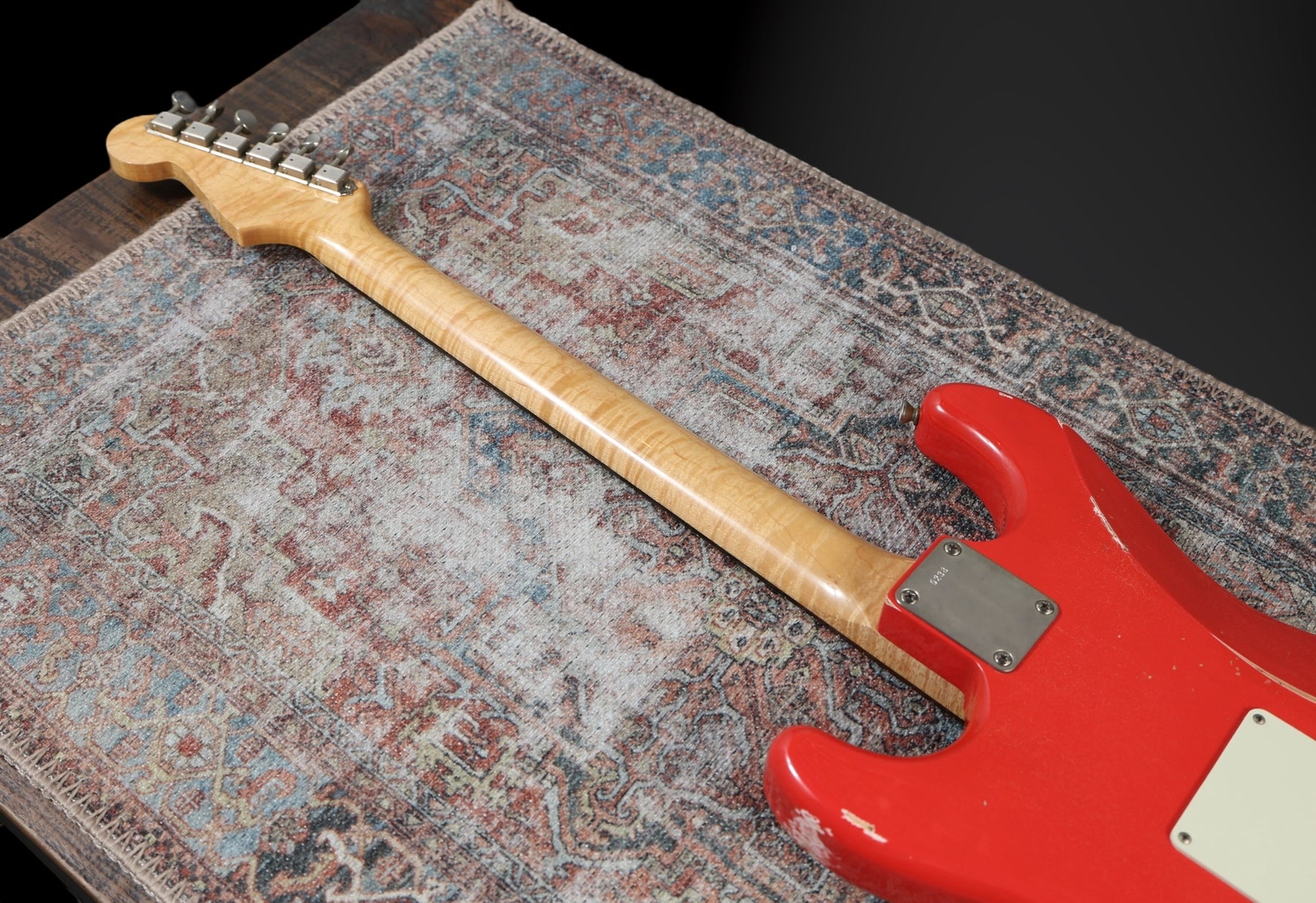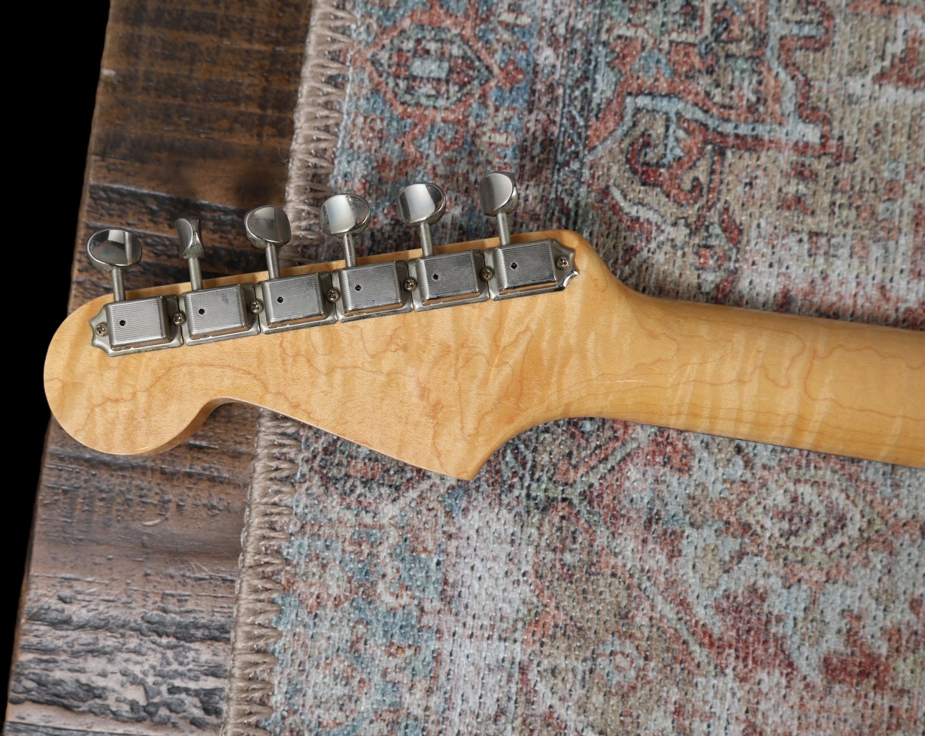 The curly maple neck is complemented by a Brazilian rosewood slab fingerboard, reflecting the classic style Fender embraced in the 1960s. This fingerboard offers an exceptional playing experience, a rarity in modern builds due to its intricate crafting process. It features Jescar 51100 fret wire shaped to a Chunky “C” profile, inspired by the iconic 1958 Fender neck, measuring .84” at the 1st fret and .98” at the 12th. A comfortable 7.25” fingerboard radius and 1 5/8” nut width achieve a harmonious balance between vintage character and contemporary playability. The guitar is a true masterpiece of tone, weighing in at a manageable 7lbs 1oz.
