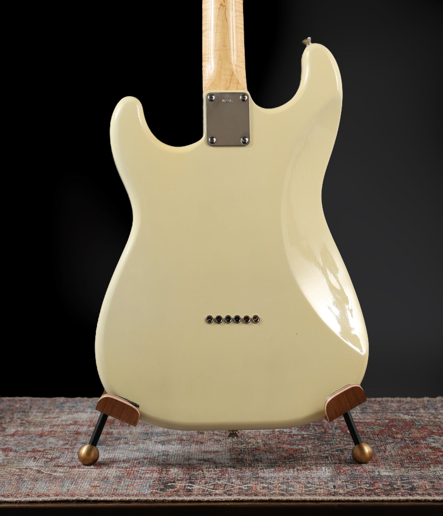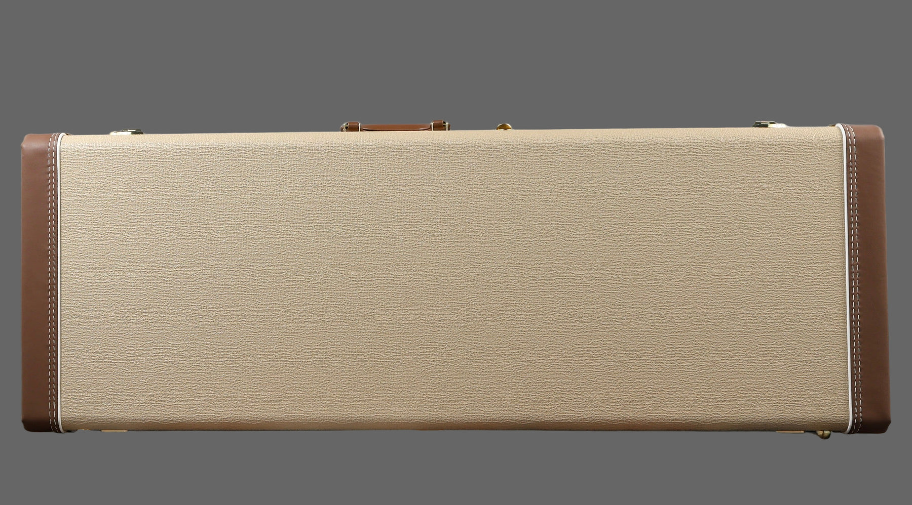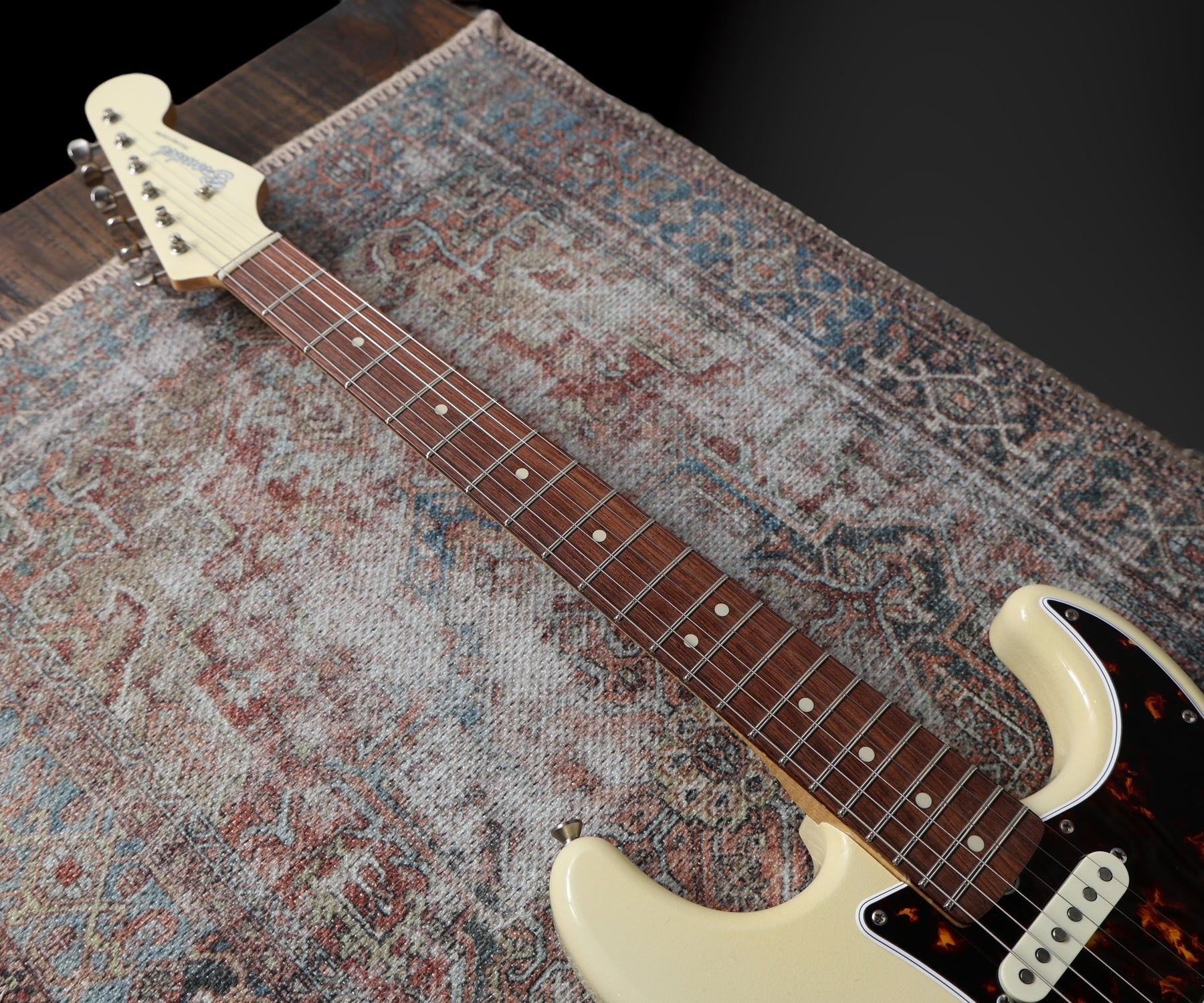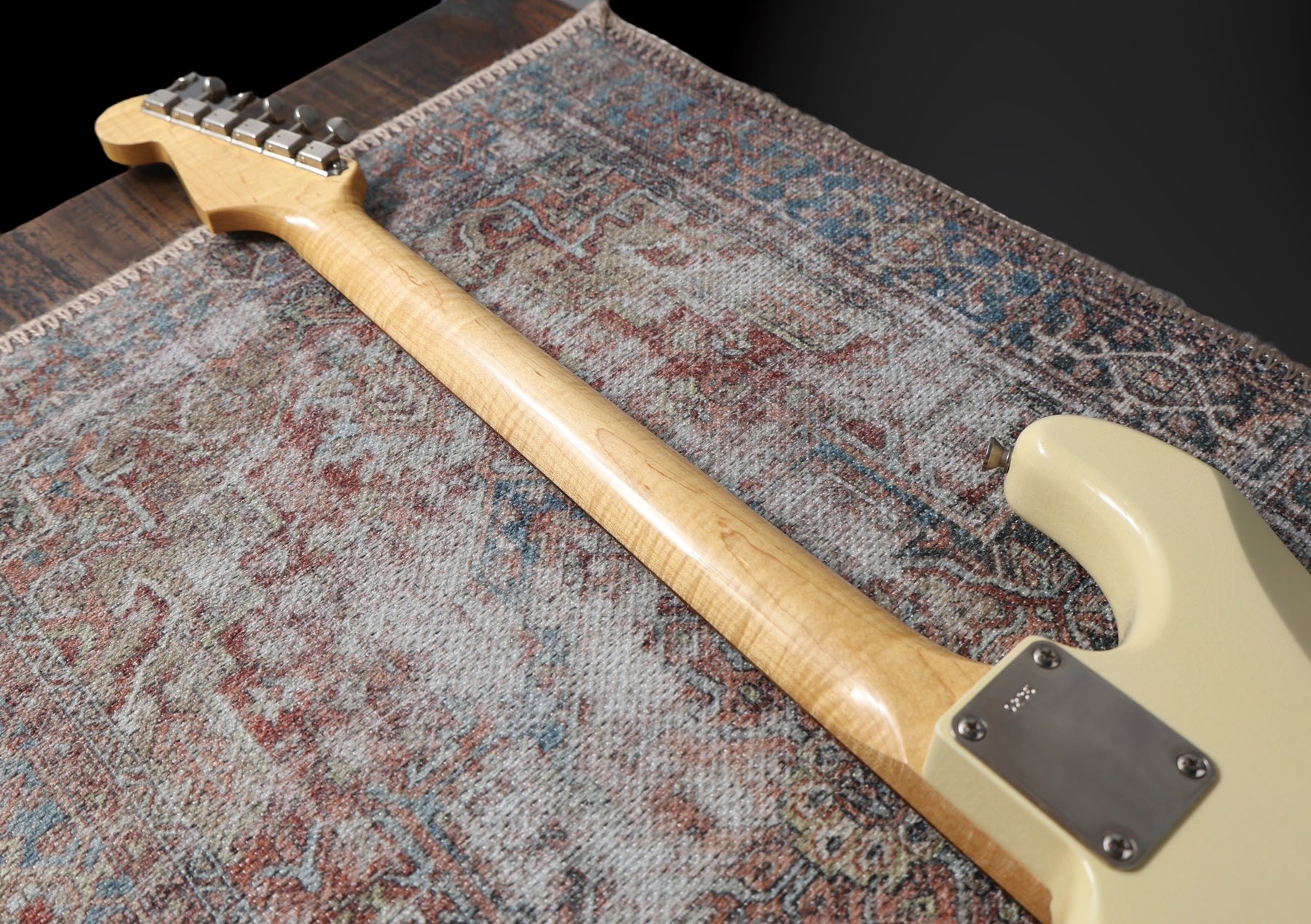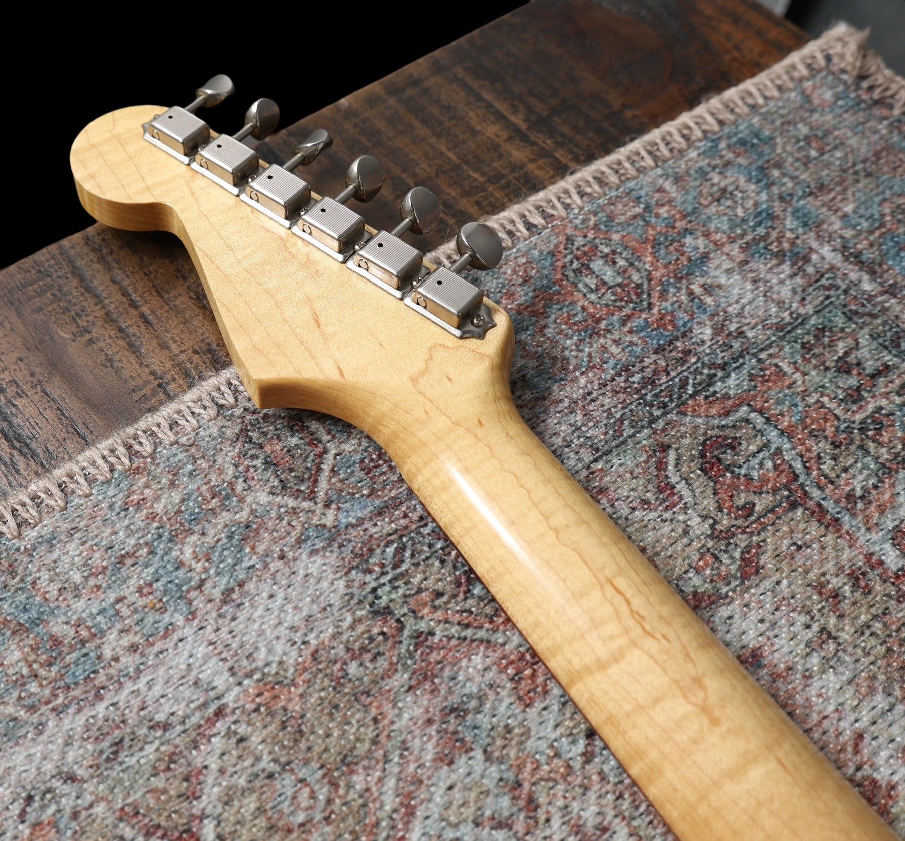 The alder body provides a balanced, resonant foundation, complemented by a beautifully carved curly maple neck with a Honduran rosewood laminated fingerboard. The 9.5” radius and 1 5/8” nut width deliver an ideal mix of vintage character and contemporary comfort. The neck profile is inspired by a classic 1958 Fender "C" shape, measuring .84” at the first fret and .98” at the twelfth fret, fitted with Jescar 51100 fretwire for smooth, effortless bends and clear articulation.
