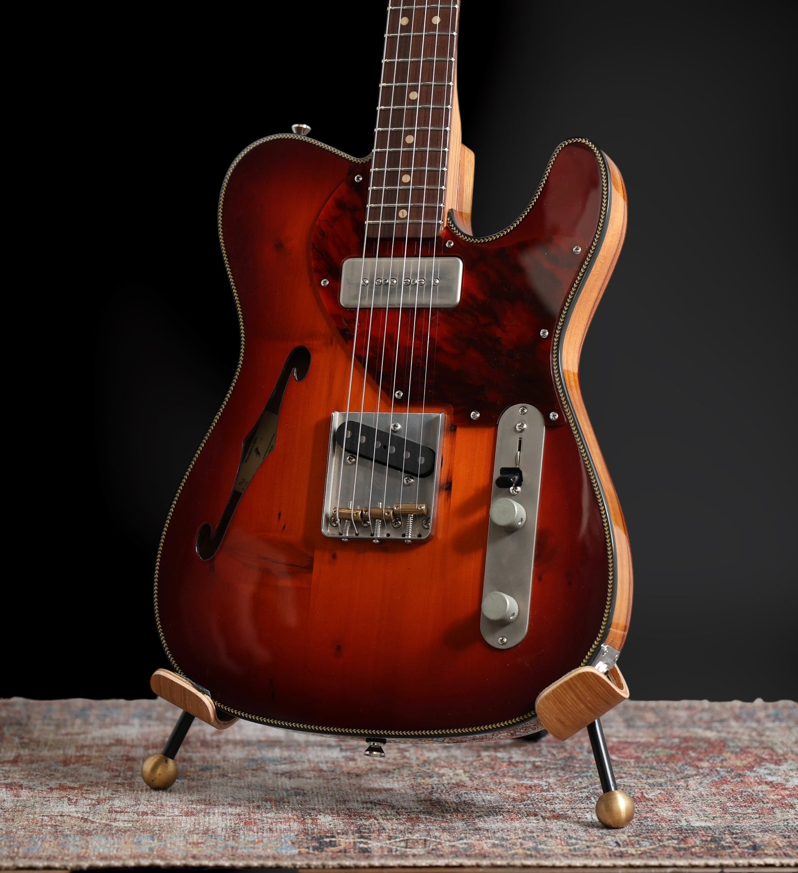 Sonically, this build has a wide, expressive voice. The Lollar P-90 in the neck offers creamy cleans, articulate mids, and an airy openness, while the Lollar Vintage T bridge brings the unmistakable bite, sparkle, and dynamic snap of a great Tele. The semi-hollow design adds warmth and an acoustic-like responsiveness, making the guitar equally suited for clean, atmospheric playing and more driven textures. This combination of woods, scale length, and premium pickups places the instrument firmly within the tonal world favored by players like Jim Campilongo and Joey Landreth, both known for their expressive touch and nuanced articulation and both of whom have signature models built by Lumiére. The lather being a semi-hollow build like this particular instrument.