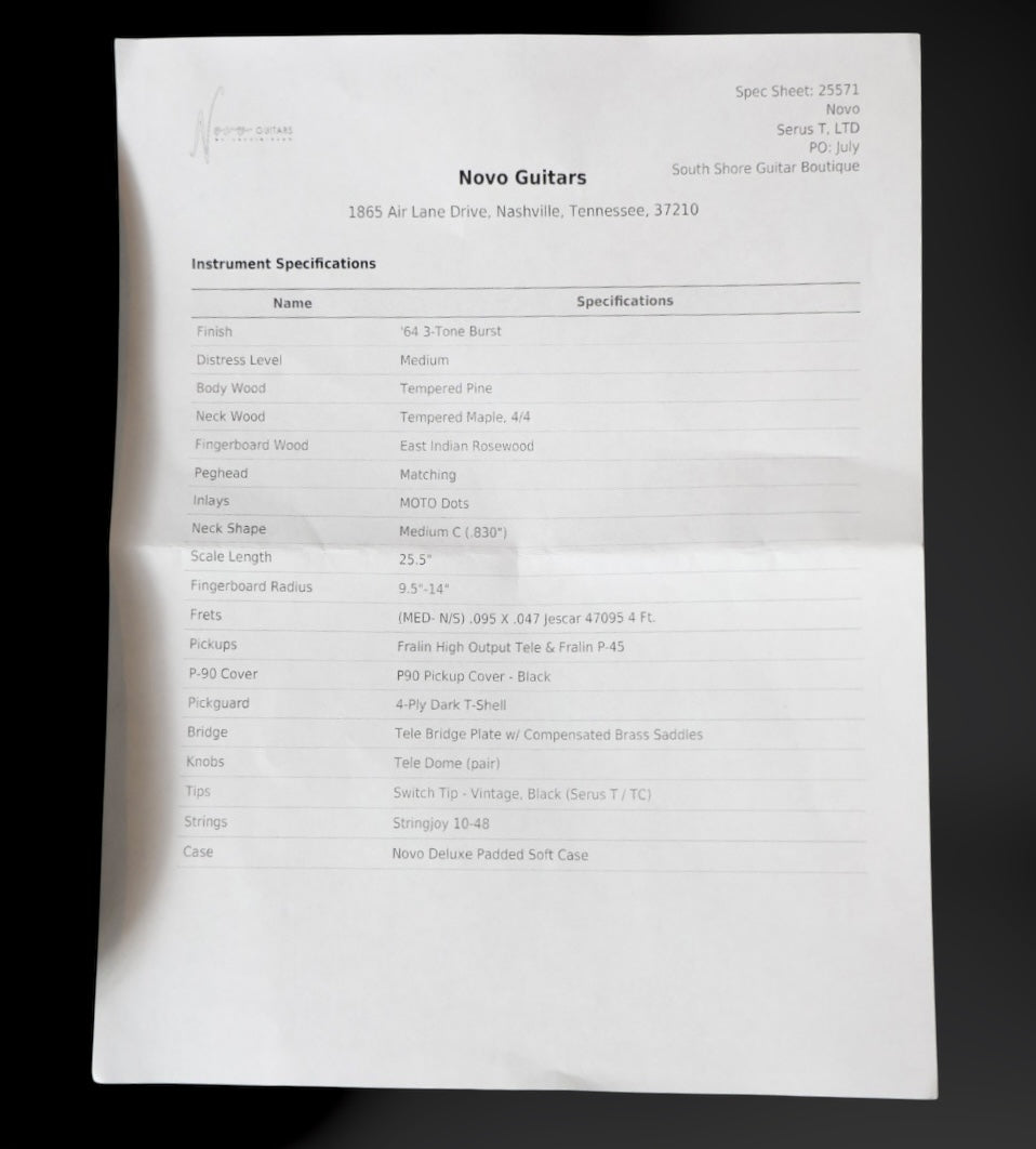 This Serus T LTD captures Novo’s signature offset feel with a classic ’64 3-Tone Burst finish and tempered pine body. A tempered maple neck with a Medium C carve and 9.5”-14” compound radius makes it effortless to play, while light distressing and nitro finish add a broken-in character.