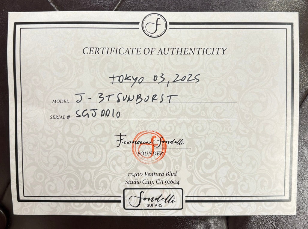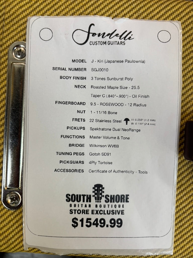 This Sondelli guitar comes with an instrument tool kit and a Certificate of Authenticity.Â