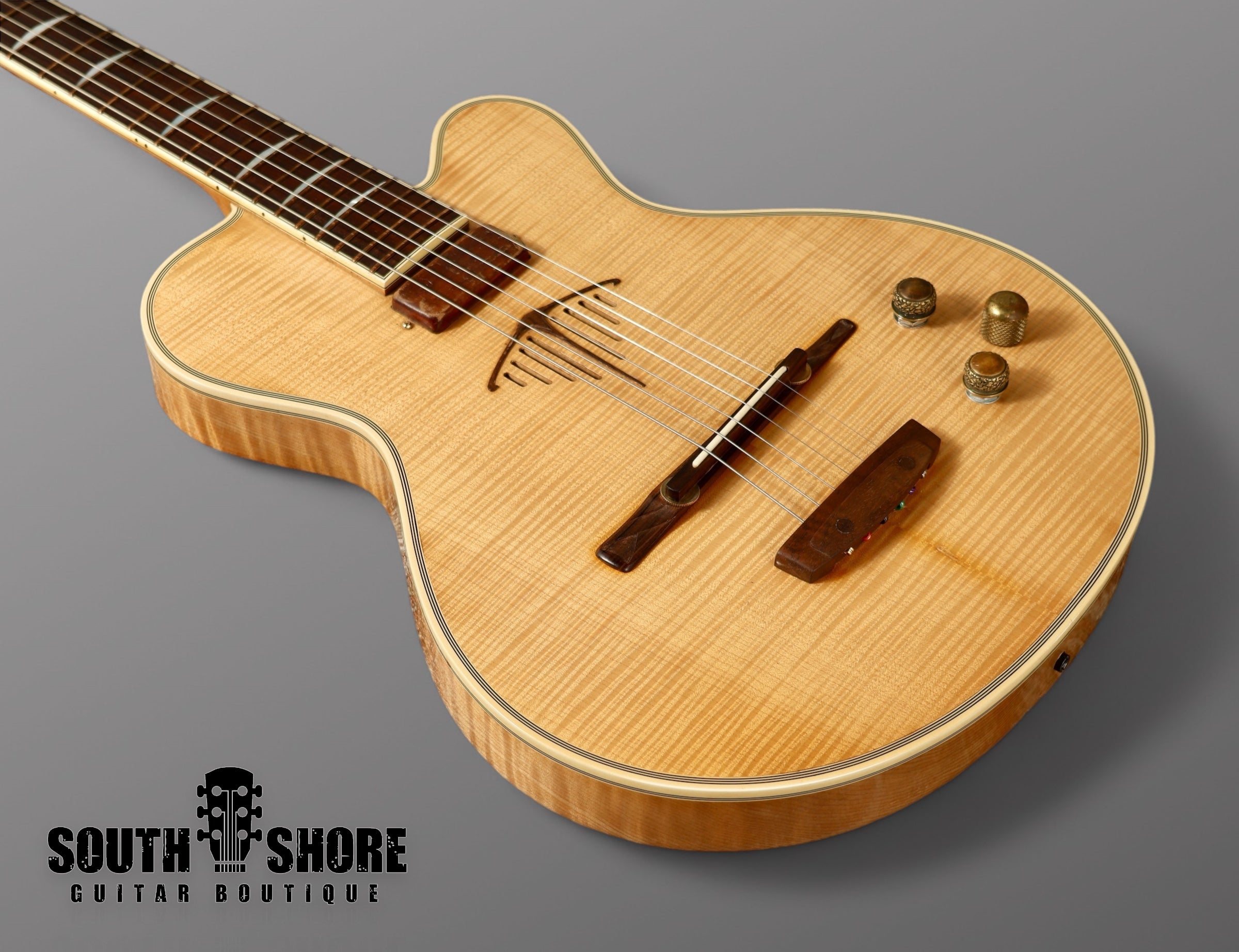 This fully hollow, 14" lower bout build features a highly figured Turkish Walnut top and body. The top is flat, with the back being fully and intricately carved. The guitar is adorned with a Gold Leaf body and headstock trim and features anciant mastodon ivory "stepped binding". The nut width is 1 5/8" but with the extra step of binding, Joe is able to allow the player to utilize the entire width of the fingerboard. This gives the instrument a feel of a 1 11/16" nut-width guitar. This build features dual humbuckers wound by Joe himself and sound absoloutly fantastic. Like a low output PAF but with a tad more single coil like clarity. The controls are volume, tone 3-way switch. You can achieve a plethora of gorgeous tones from sweet Jazz to Rock and Roll or Blues. This guitar also sounds beautiful fingerpicked.