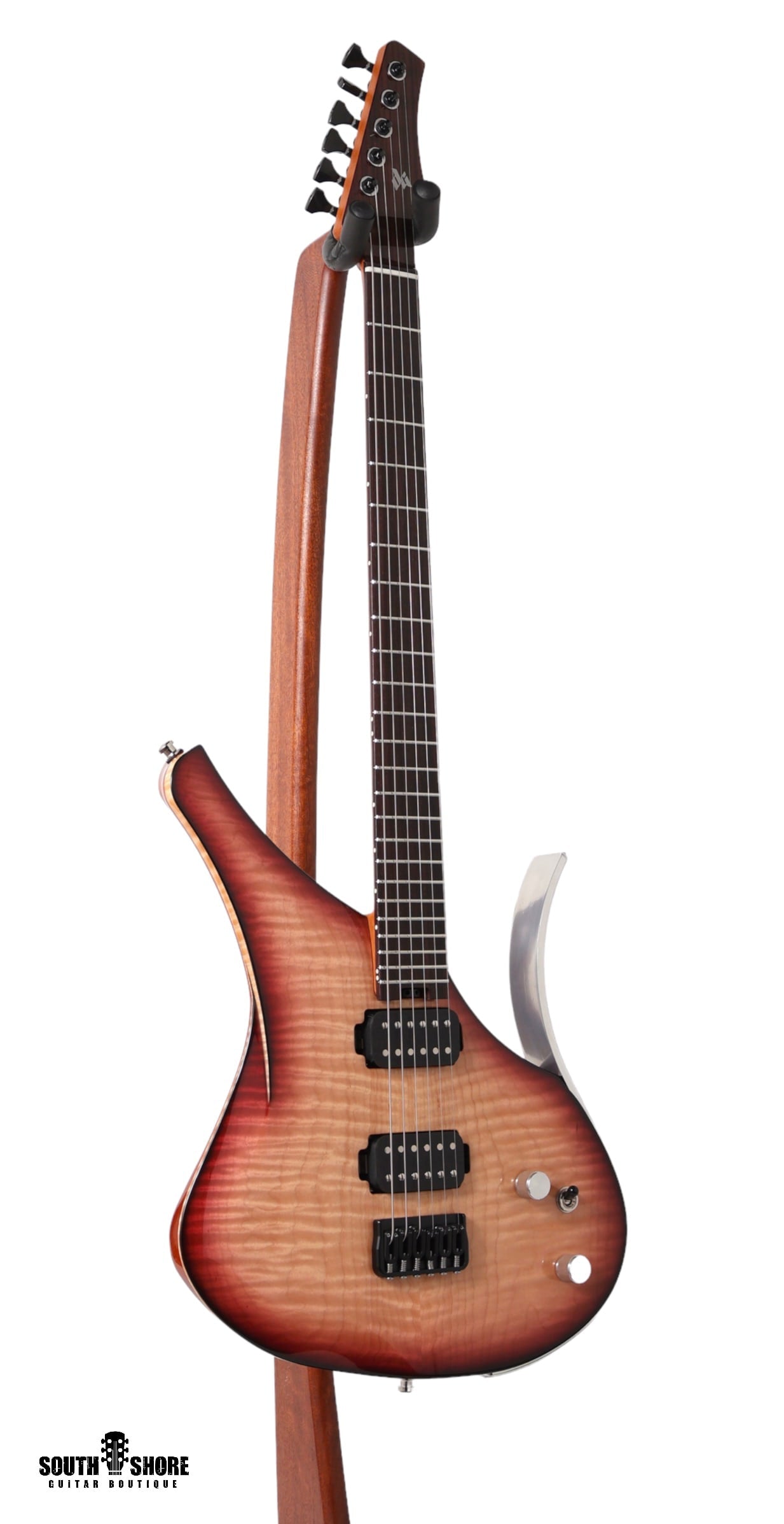 The neck profile is a slightly chunky C with 22 frets to the body. The guitar has a compound radius 9.5"-12" so that first and second position feel great without the board feeling to flat, however as you go up the neck it becomes a flatter 12" radius for bending strings without ever fretting out.