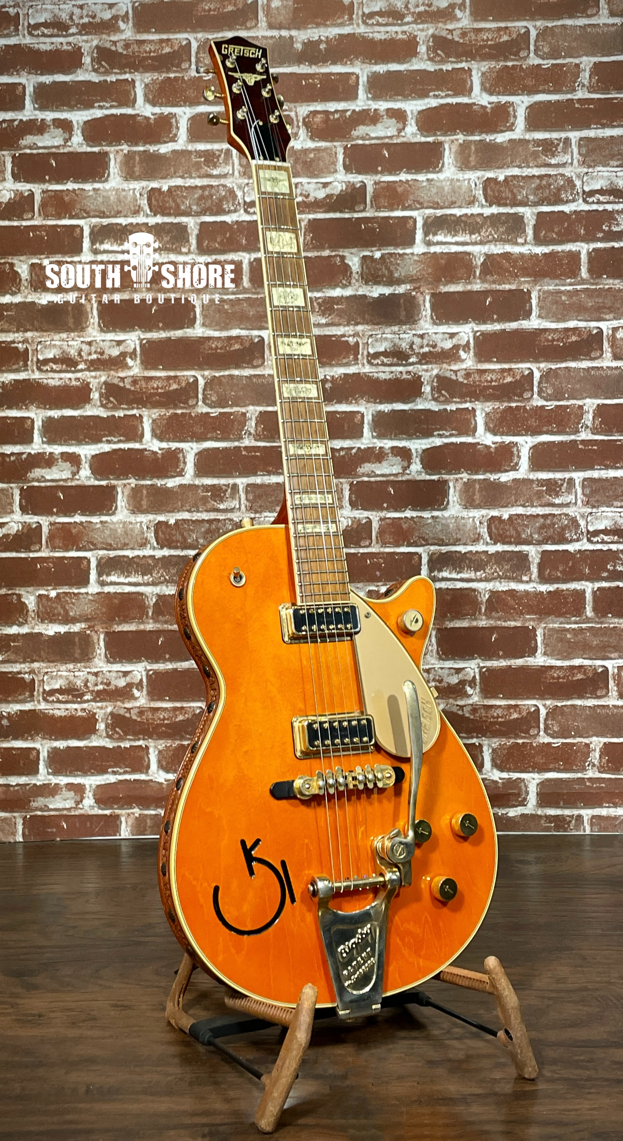 A great playing, recently setup made in Japan Gretsch Anniversary model. This guitar comes with a Vibramate upgrade to make re-stringing the guitar more simple. Everything is in perfect working order and the vibrato is very responsive compared to others we've tried. This guitar shows only light play-wear upon very close inspection such as small scratches on the back of the body. The frets have a full life ahead of them as this instrument was very sparing used, with maybe only a few hours of play time. This particular example is also a nice and comfortable weight at only 7lbs 6.3oz. Comes with OHSC.