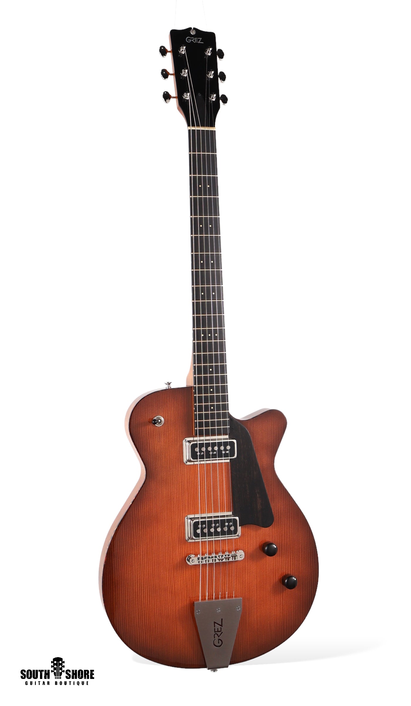 Specs: • 13.25" semi-hollow body, 1.75" depth •2-Piece Quilt Figured Old-Growth Redwood top w/ Binding and Purfling • Honduran mahogany body & neck • Macassar Ebony fretboard • 25" scale length • 21 Nickel/Silver Jumbo fret-wire • 12” Radius • Med-U neck profile .83"-.95", Bone Nut 1 11/16" • Lollar Low Wind Imperial Humbucker set • TonePros AVR2 bridge and Grez Aluminum Tailpiece • Nitro Dark Burst finish • Reunion Blues protective gig-bag • Weight: 5lbs 7oz
