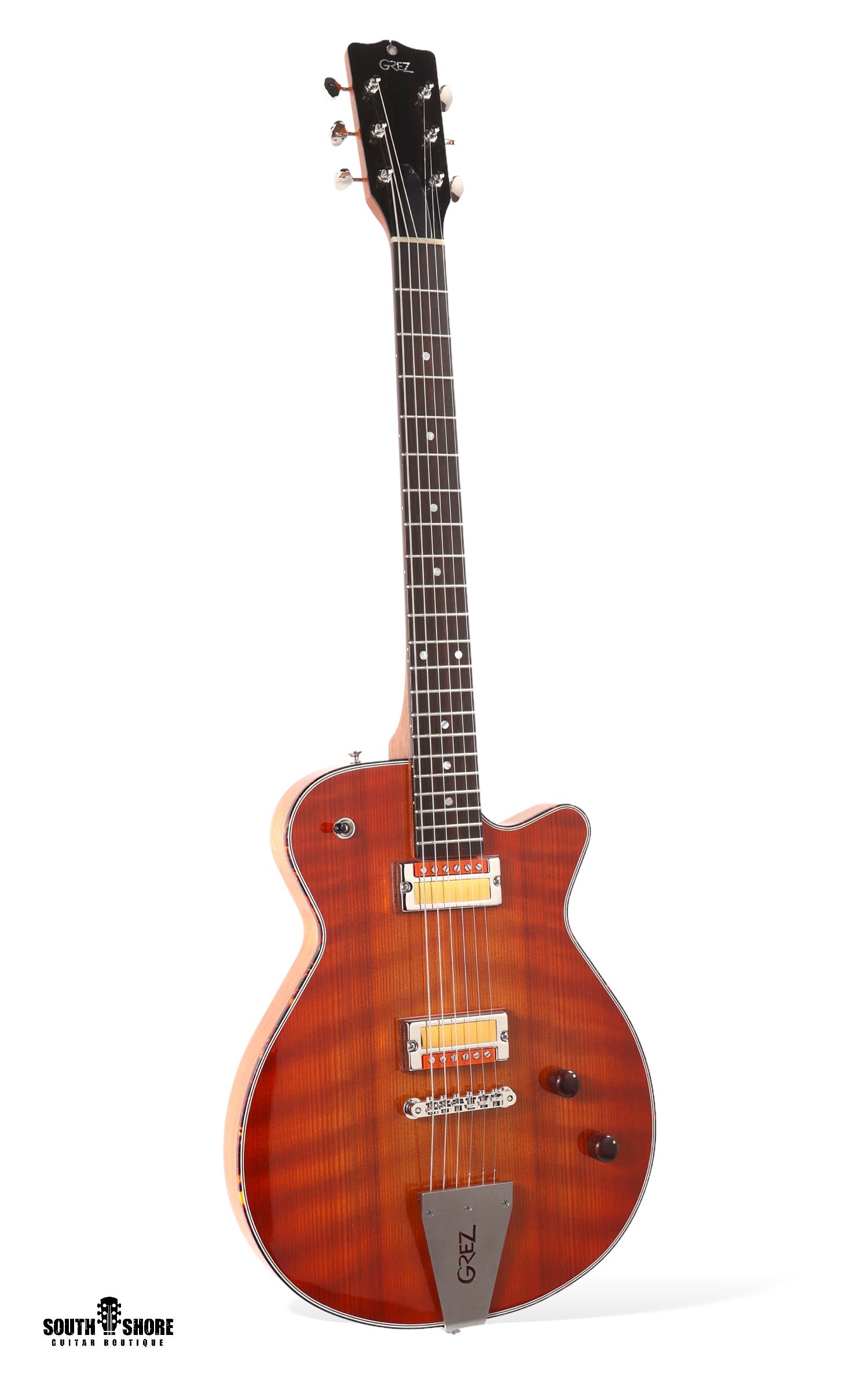 An awesome variation on the Grez Mendocino with a beautiful strait grained old growth redwood top, Light Brown Burst finish and white front body binding.
