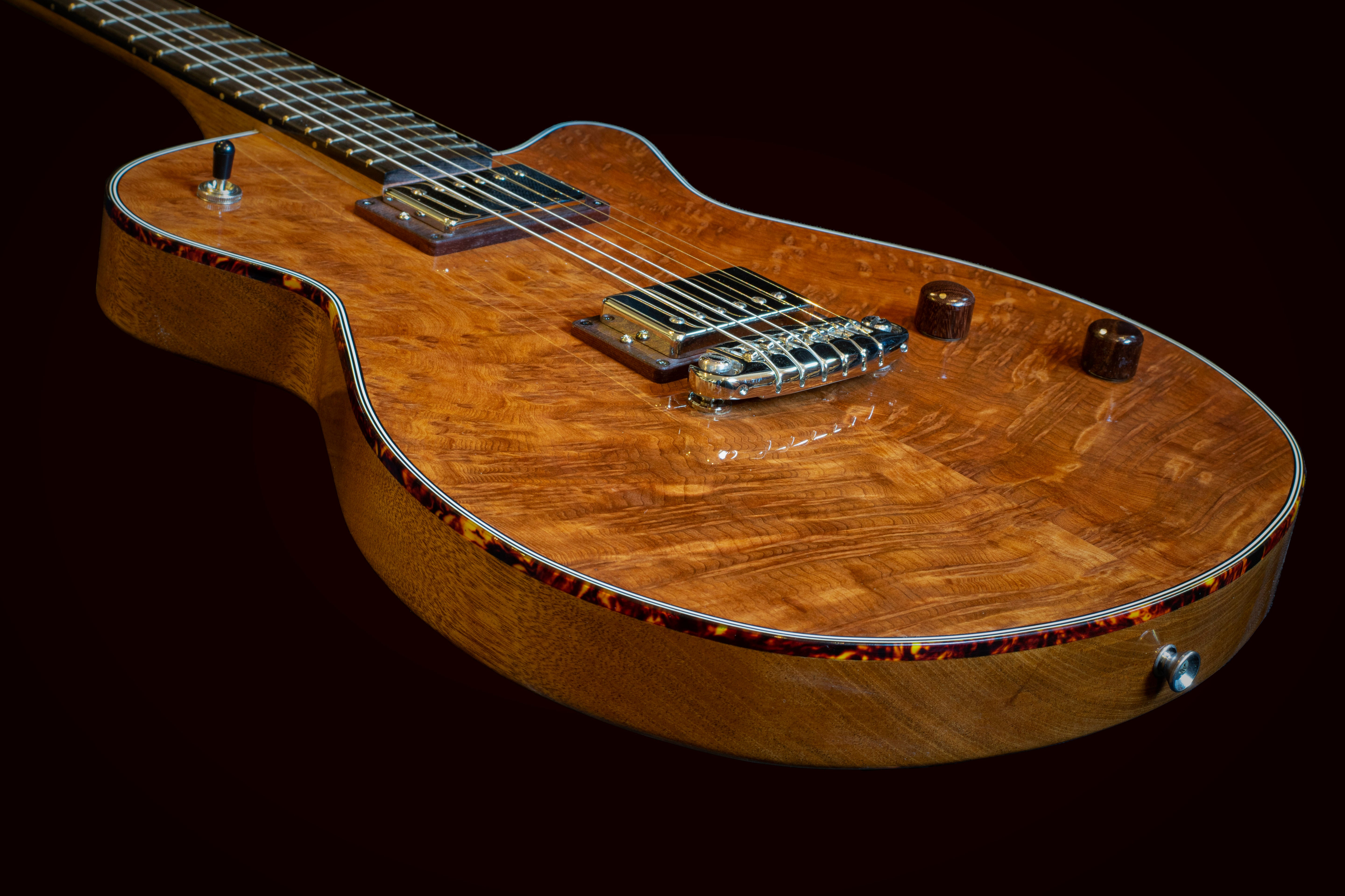 Here's a gorgeous new custom Grez Mendocino. This particular guitar has lots of little details that accentuate the natural beauty of the Old Growth Redwood, Quilt-Figured top. Barry put a beautiful Dark Burst finish on this instrument, which just pops with the dark Ebony board and Grained Ivoroid binding. You don’t see many of these with a bound neck, which gives the guitar an extra classy esthetic. There’s Ivoroid visible around the top of the body as well. The Mendocino typically comes standard with either Lollar Gold-Foils or Imperial Humbuckers. This is the first Mendocino with Curtis Novak Gold Foils. While they maintain the open, airy & balanced tone of the Lollar Gold Foils, they have a slightly more focused, articulate clean tone and some extra bite and output when overdriven or pushing a tube amp. Curtis Novak is known for winding extremely genuine sounding vintage-spec Gold Foil reproduction pickups; so these fit the bill perfectly and look beautiful at the same time. The guitar also features binding around the handmade wooden knobs, MOP fingerboard dots and Nickel/Silver Jumbo fret wire. This Mendocino plays with ease and has a sophisticated, highly chambered semi-hollow voice, both acoustically or plugged in. A phenomenal build all around.
