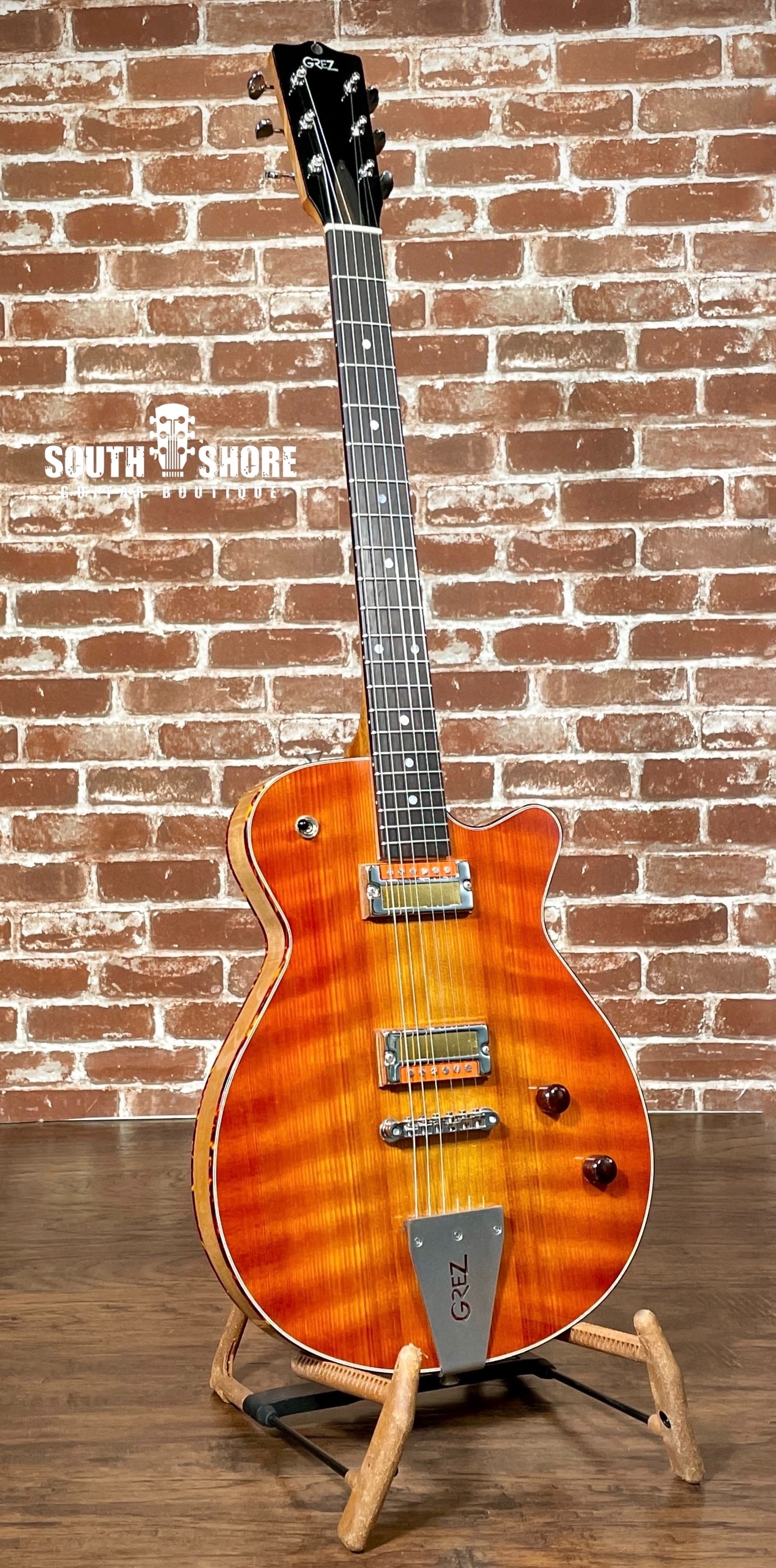 Grez Guitars are hand built in California one at a time by Luthier Barry Grzebik. The Mendocino is a breath of fresh air in the world of hand-built Electric Guitars. Grez Guitars are a unique blend of high quality, old world craftsmanship and forward thinking design. The idea behind the Mendocino was to build a super light weight (in this case 5lbs 3oz) and compact highly chambered Semi-Hollow body guitar, that sounds like a mix between a full-size Semi-Hollow guitar and an Archtop. This particular extremely customized and classy example, features a highly figured Quilt Old-Growth Redwood top, top tortoise binding and 3-ply white/black/white purfling. Nothing sounds quite like the mellow yet ultra lively shimmer, you get from old-growth Redwood. Especially wood like this, that has had 100 years to dry. This guitar is very loud acoustically, with tone that is more than satisfying. When plugged in the mix of the Lollar Low Wind Imperial Humbuckers and the highly acoustic Redwood body, meld together in a beautiful, airy, dreamy way. These guitars evenly cover all playing styles with ease. From fingerpicking Country to Jazz, Western Swing, Rock and more. This instrument has a beautiful Macassar Ebony fingerboard with a 12" radius. It is a true joy to hold and play. The Lollar Low-Wind Imperials in this guitar sound incredible with 3D clarity clean, yet they also take gain extremely well, with overtones and harmonics that just leap off the fretboard. This particular example has a Resomax Wraparound tailpiece for more sustain. Truly a heirloom-quality, Luthier built guitar at a wonderful price-point, that you will enjoy for a lifetime. Easy playability and a perfectly dialed in, nice and low action make this Mendocino Custom a true joy to play, both plugged in and acoustically.