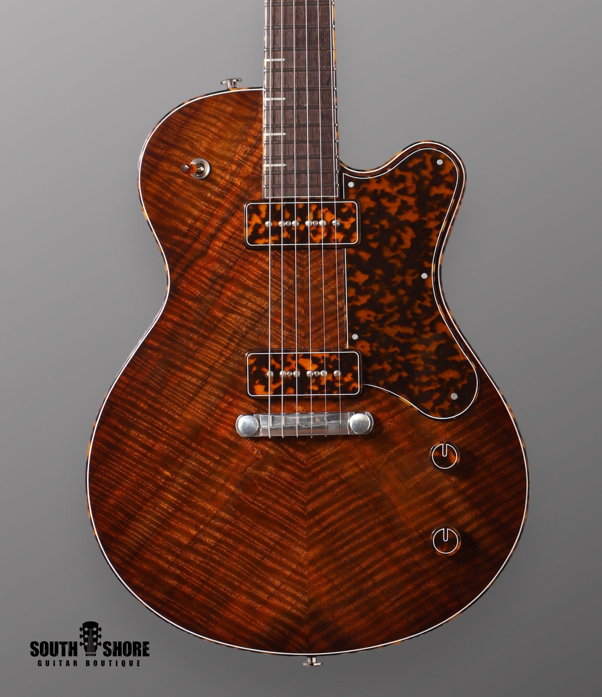 We live for original instruments like this and love Dynasonic Pickups and 24” Scale guitars around here. In tone & playability, this Lupine Short Scale is as versatile of an instrument we’ve ever come across. While it’s the same scale as a Fender Jaguar the guitar has a set neck and the available tones via the T-Armond pickups are big, full, twangy and harmonically rich. Dearmond Dynasonics are some of the most Hi-Fi tone-full pickup designs ever created. They are single coils with individual adjustable 1/4” magnets that help to pickup the full range of the guitars strings as they vibrate. Unlike the non height-adjustable Dynas found in 50’s Gretsch Duo-Jets, Falcons & many Guild instruments. This recreation of the Dyna by TV-Jones is an exact P-90 size replacement pickup with adjustable height, via the two center screws.