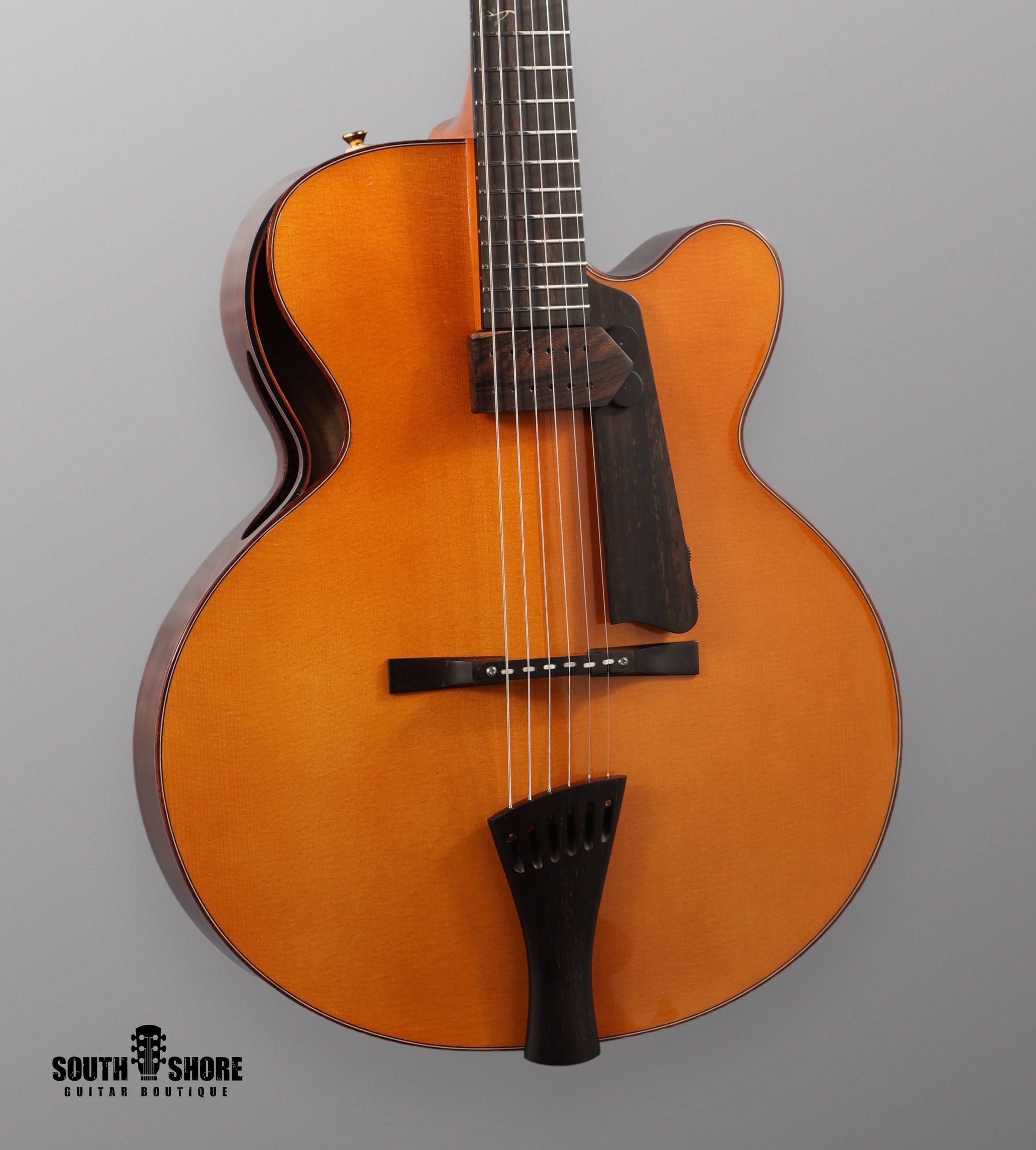 The Siracusa 16E is a fully carved and hollow Archtop with a 16" waist. It features X braces, two Jaén wound hum-bucking pickups and and a myriad of switching options, that are easy to wrap your head around. With your three way switch the first position will be the neck humbucker alone and the third will be the bridge position. In the middle, you have both pickups outer coils in series as a humbucker. Both pickups are floating on the ebony pickguard. Each pole piece is adjustable and the bridge pickup is height adjustable. You can raise or lower the height of the bridge pickup by raising or lowering the pickguards bracket. These pickups are not what most players think of when they imagine a floating hum-bucker. Most floating pickups can leave a lot to be desired, due to their small footprint and narrow bobbins; which can only have so many winding on them. These Jaén-wound humbuckers are big and robust, yet clear and dynamic. Weather you are looking for warm and clean Jazz tones or a Chet Atkins style thump in the middle position; it’s all there and in spades. The Siracusa 16E can even pull off Chuck Berry-like bridge position tones with ease.
