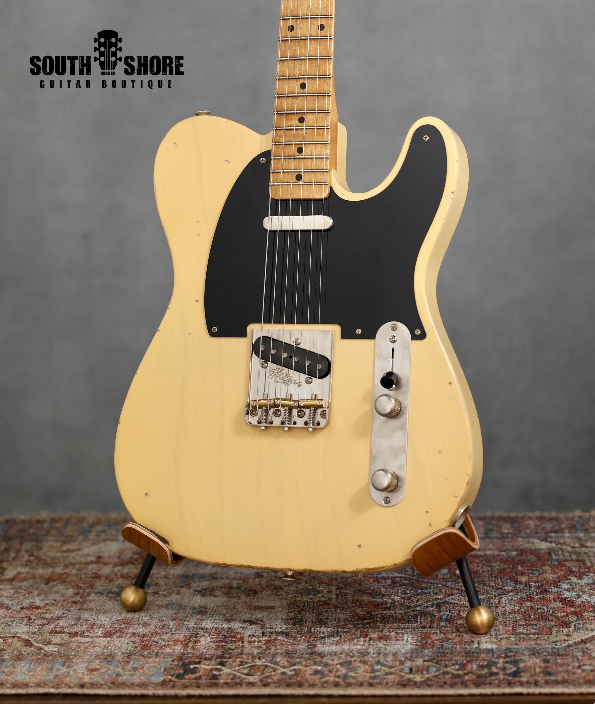 When looking at the instruments appointments the attention to detail is remarkable throughout the entirety of the guitar. From the German Carve top with Tortoise pickguard, to the cream binding and B/W/B body purfling, all the way to the carved back with both tummy and forearm contours; the work is fluid and precise. This Skylighter features a one-piece mahogany body. We also love the color scheme of Oly White, Tort, natural Mahogany and Birdseye Maple. The red headstock decal looks especially slick since it matches the pickguard so well. Fretwork, setup, tone and playability are all top tier.Â