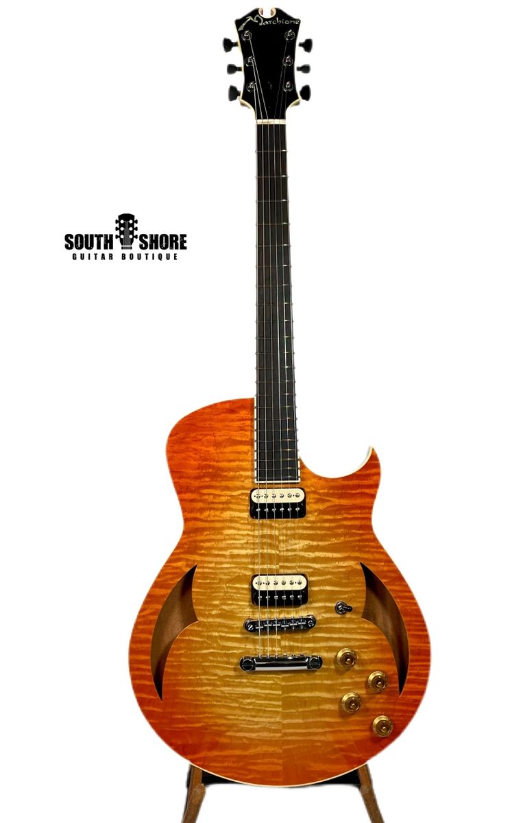 Am awesome build by Canadian Luthier Matt Maranger. This Newhorizon 3 model features some wonderfully rich original hand-wound large humbucking pickups; mixing the tonality of a Wide Range Humbucker, Firebird pickup and Gold Foil all under one cover. While the scale is a full 25", the body is compact (yet proportionate to the rest of the build) making for a very travel friendly guitar. All in all near mint condition w/ black tolex hard shell case.