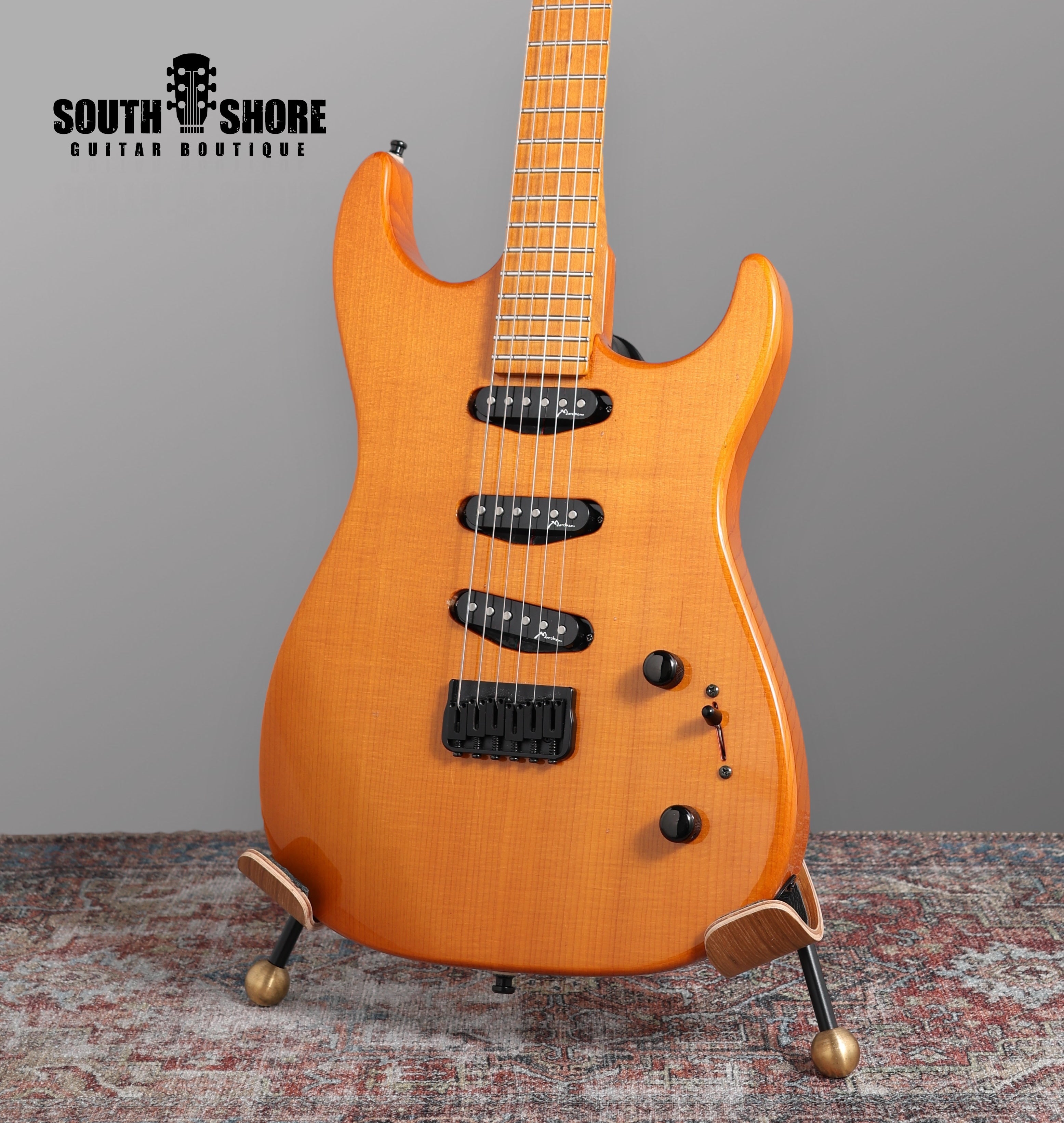 The black hardware, Sperzel locking tuners, and Wilkinson hardtail bridge complement its sleek design. It features custom-designed S/S/S Strat pickups by Marchione and Dimarzio as well as top-tier electronics, including volume and tone controls, a 3-way switch, Evidence Audio cables, and other USA components. Weighing in at just 6lbs 1.9oz, this highly resonant and lightweight instrument still retains that long singing sustain Marchione is known for.