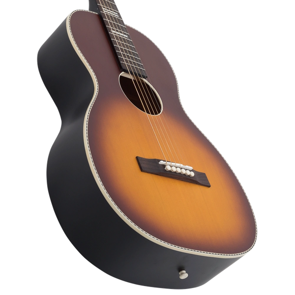 The spruce top provides the foundation for classic acoustic tone beneath the Tobacco Sunburst finish. The bound soundhole and Harmonella stencil fretboard markers are both functional and stylistic.