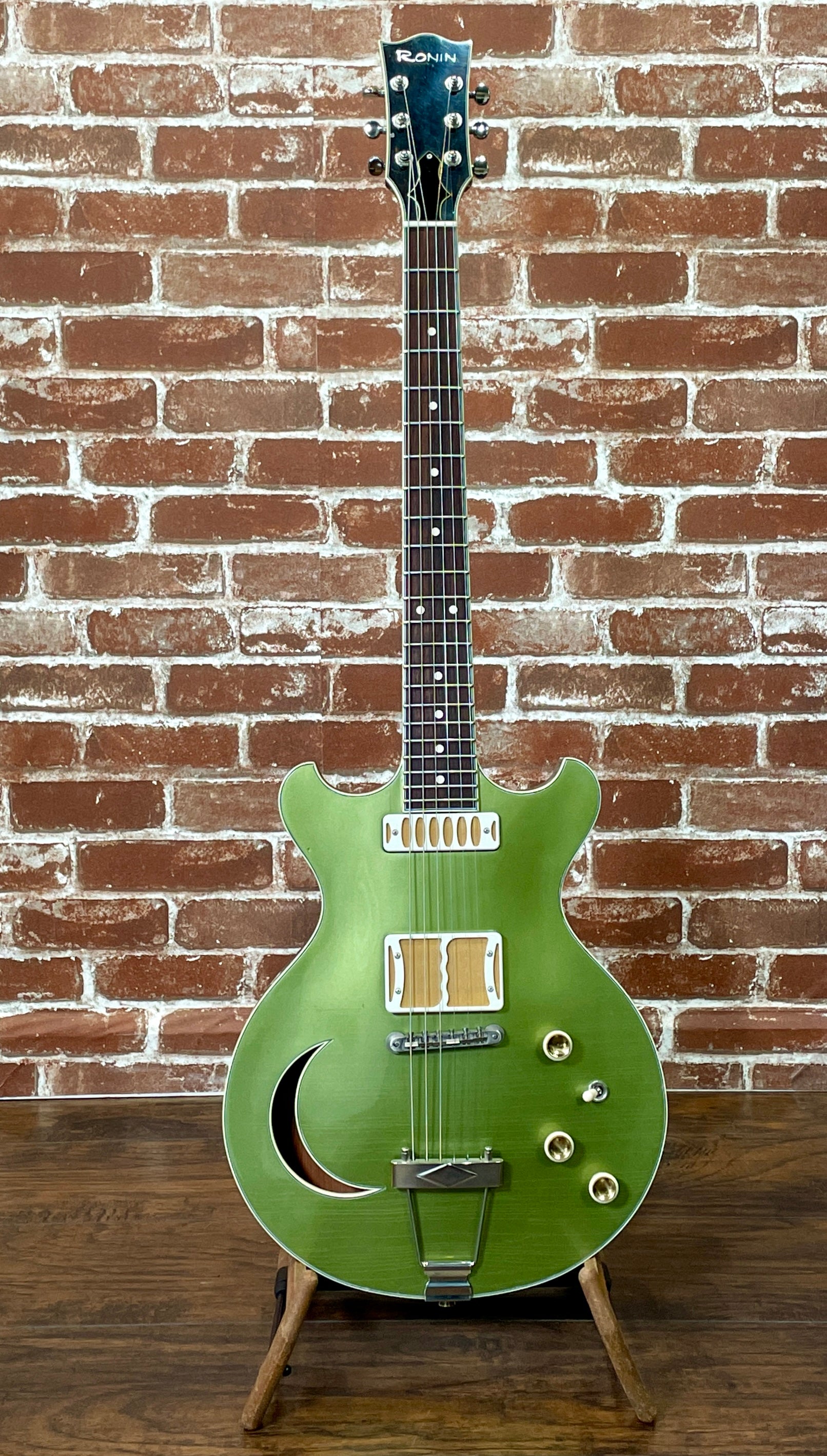Ronin Guitars are getting more and more difficult to find, especially the set-neck models. This Badmoon is a unique one with an Aged Honey Burst finish and true ancient Mammoth Ivory pick-guard. A recent pro setup ensures phenomenal playability. The guitar is set up with 10-46 gauge strings with low action. The frets also have their full life ahead of them.