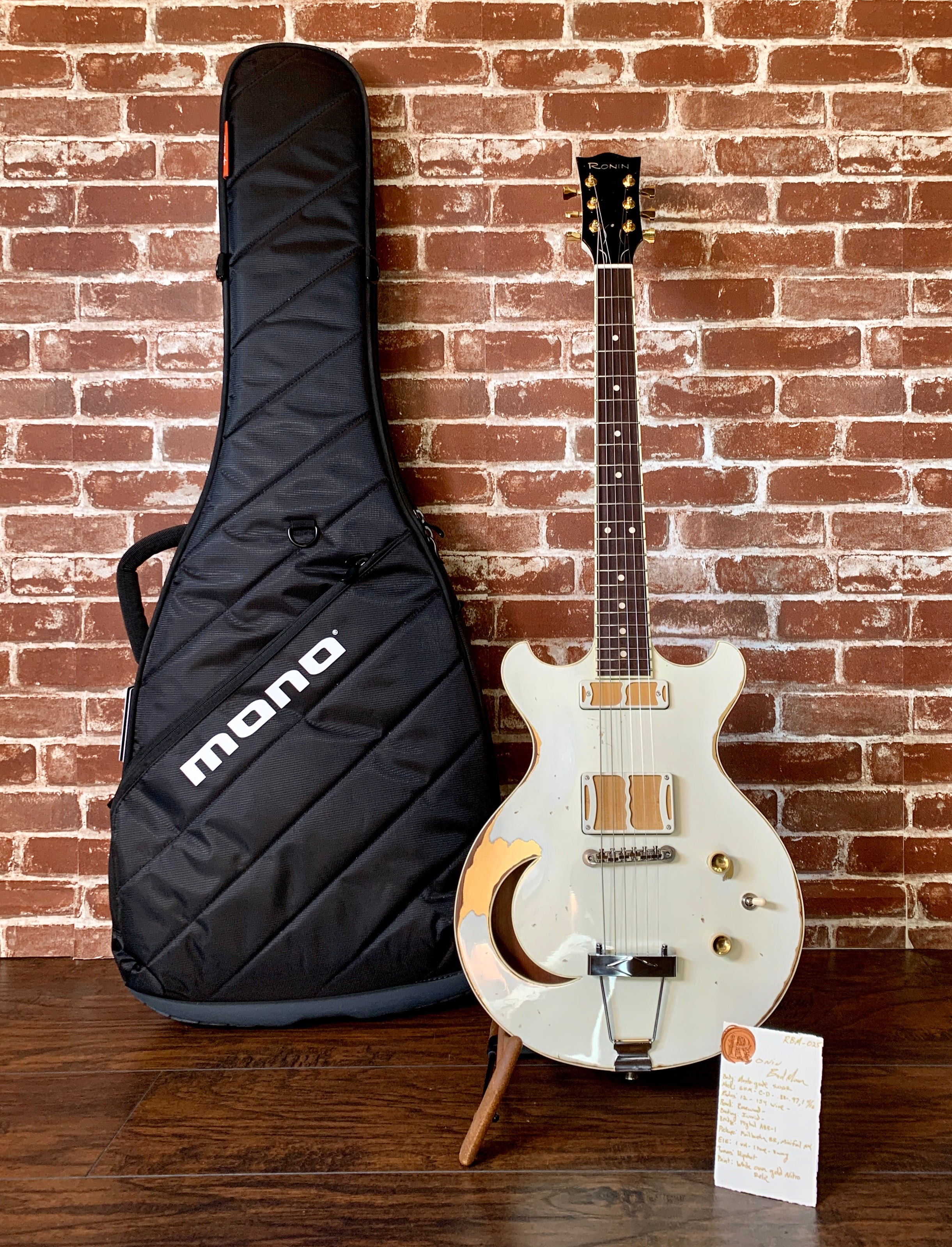 The Badmoon is a set-neck 24 3/4" scale Semi-Hollow Body (The 24.5" scale stated on their website is a typo) It also has a hand carved top by Ronin Guitars. The model is as rare as they come. This Badmoon is extremely loud unplugged, due to its Old-Growth Redwood body and Honduran Mahogany set-neck. All of the acoustic information gets transferred to its beautiful electric voice. It blooms with a breath like pulse when chords or notes are left to ring out and has tremendous sustain and perfect note-to-note separation: Much of this is due to its construction and the unique Ronin pickup designs. It is nothing short of amazing and an incredibly inspiring instrument. Play with a light touch for clean and warm tones with tons of clarity or dig in for biting, snappy, blues and rock tones. The guitar reacts extremely well to where the volume & tone controls are set, giving you a wide palate to create your own signature sound.