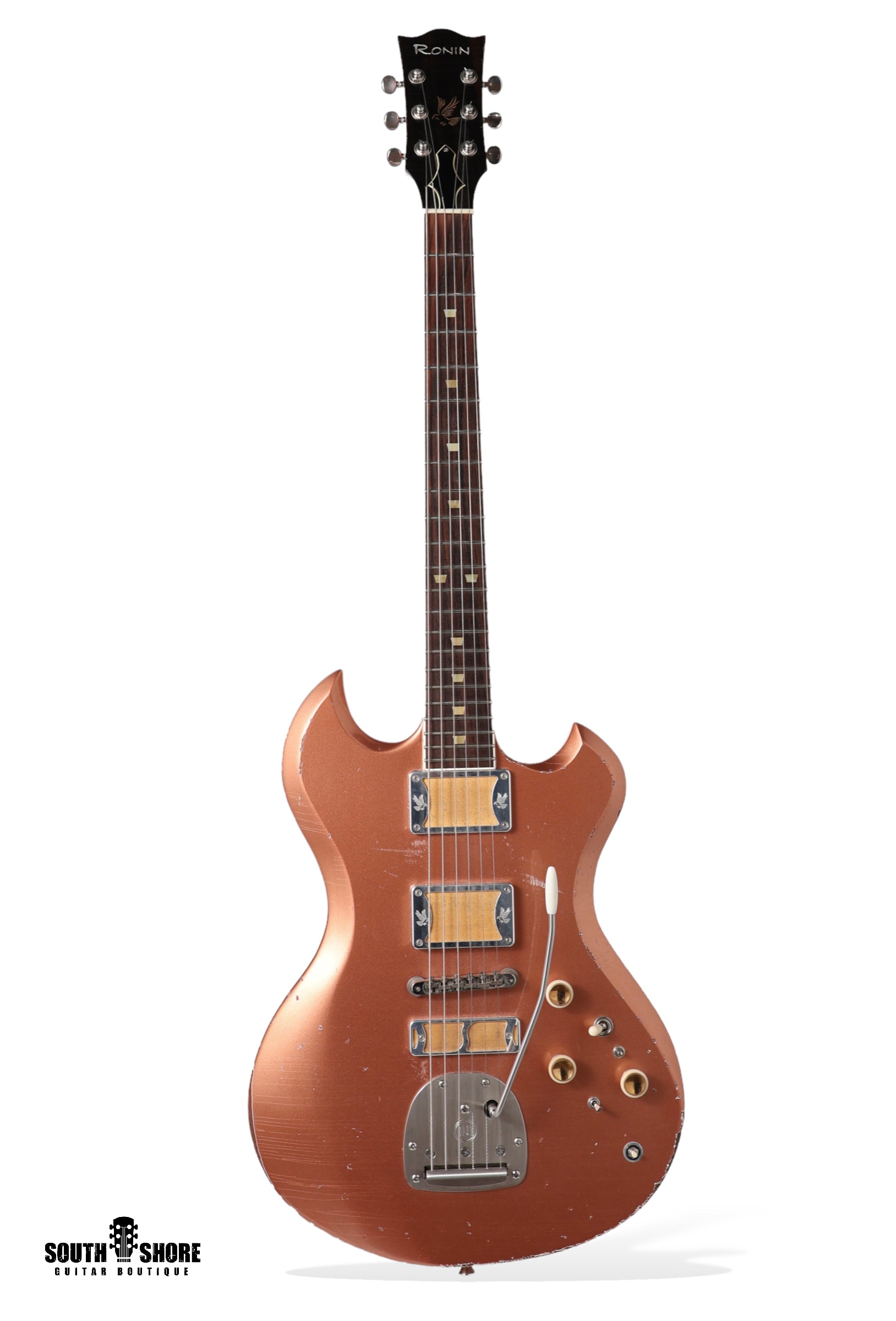 The Badmoon is a set-neck 24 3/4" scale Semi-Hollow Body guitar by Ronin and is as rare of a model as they come. This guitar in Aged Black is extremely loud for an electric acoustically, due to its Old-Growth Redwood body and Honduran Mahogany set-neck. All of the acoustic information gets transferred to its unique and sophisticated electric voice. It blooms with a breath like pulse when chords or notes are left to ring out and has tremendous sustain and perfect note-to-note separation: Much of this is due in part to it's construction, the large 50's style "Les Paul" U shaped neck and the unique Ronin Foil-Bucker & Single-Foil pickup designs. It is nothing short of amazing and an incredibly inspiring guitar. Pick with a light touch for clean and warm tones with tons of clarity or dig in for biting, snappy, blues and rock tones. The guitar reacts extremely well to where the volume & tone controls are set, giving you a wide palate to create your own signature sound.