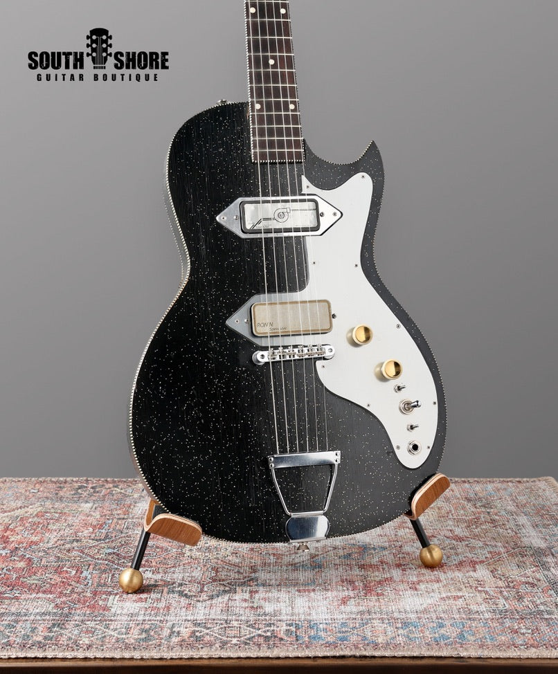 The Magic Button brings into play a specialized passive piezo pickup that sits inside of the bridge pickups cavity route. Engaging it can lead to many musical results and enhances the sounds of the very resonant Old Growth Redwood body. Upon pressing it, you'll be able to enhanceall the subtle nuances of the instrument. Letting you tap and play behind thenut or scratch at the springs. You can also get acoustic like tones that areblend-able with the other pickups. As you roll down your guitars volume control,it becomes more present, this can lead to lap-steel, banjo, dobro and many other experimental but extremely musical sounds. The guitar also has onevolume and one tone rather than two tone controls. The input jack is on the topof the guitar rather than the side. We just love the tuxedo look. Black with a “SmokedParchment” pickguard and Gold inlayed Tea-Cup knobs. The matching blackheadstock, metal pickup covers and beautiful body contours complete the look ofthis beautiful heirloom quality custom guitar.