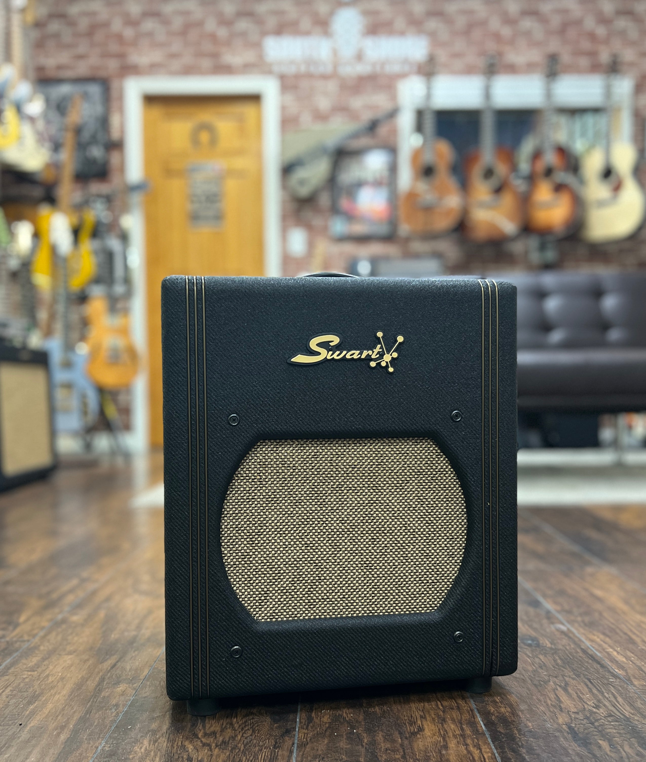 The Triple Tone was Supro’s 3-pickup version of the Dual Tone, which was produced only for a single year. Besides the beautifully distinctive jet-black finish, gold hardware and double pickguard, one of the main highlights of this instrument was the trio of Ralph Keller-designed Vistatone pickups. Although they look like humbuckers, they were in fact unique noise-cancelling single coil pickups that delivered a fairly hot signal for the time.