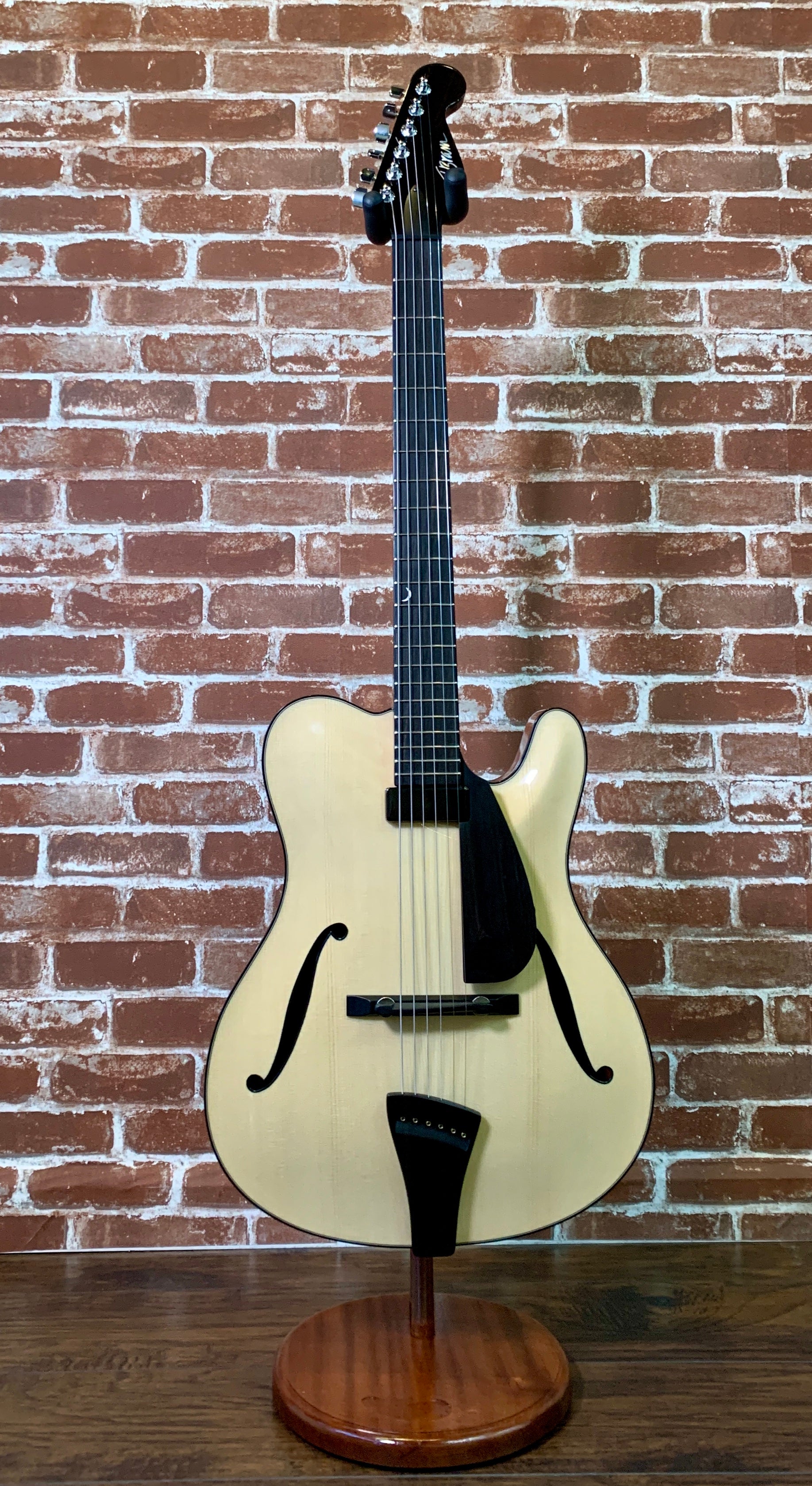 Tim has developed an Archtop design that blends the best qualities of both a traditional fully hollow, carved-top Archtop and a smaller bodied thinline "ES style" guitar. The lower bout of this model is only 14 1/2" but it sounds huge both unplugged or amplified with its single floating hand-wound Kent Armstrong Mini-Humbucker Pickup. The body somewhat resembles a Tele as does the six in a row tuner head stock, hence the name "Tribute Archtop" as a tribute to the Tele. The scale length is 25" for a slightly slinkier feel than the more commonly used 25 1/2" scale length. This scale allows the player to use heavier string gauges without the tension feeling to stiff.