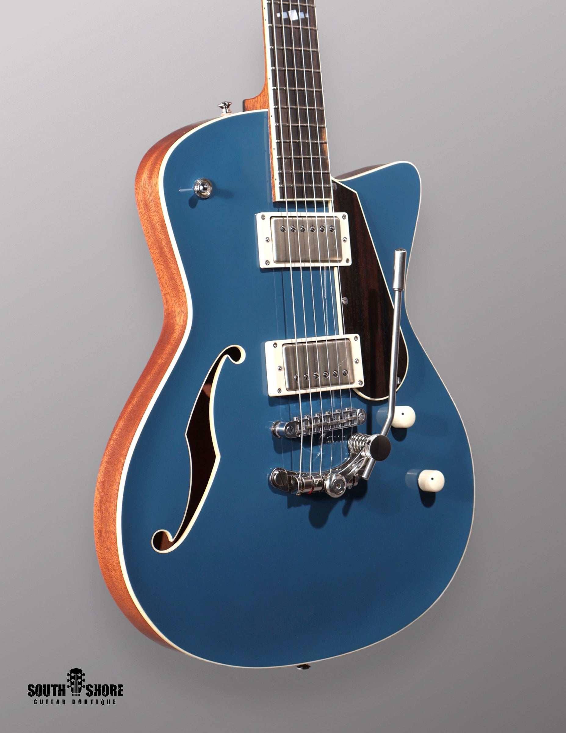 While the Deckard carved top, semi-hollow body model does not necessarily look, feel or sound exactly like any particular vintage guitar of the past, you can certainly see some classic influences; that make it a real treat to the player looking for an inspirational and unique tool to express themselves on, while not sacrificing that vintage familiarity many have come to enjoy and love. While this is a set-neck, semi hollow guitar, it seems to take more cues from a Fullerton style of guitar; with its 25 1/2" scale length and 9.5" radius. Though its a mixed bag as the Kalamazoo influence certainly shows as well, with its carved semi-hollow construction, 3 pus 3 headstock and PAF style Humbuckers. Yet these Cornucopia Humbuckers hand-wound by McNelly Pickups have some neat tricks up their sleeves. You can expect clear and articulate clarity with a subtle airy and woodiness to each note. They hold together very well both clean and with overdrive, never getting at all muddy. Harmonics seem to just leap off the fingerboard with a haunting acoustic presence, almost like a built in reverb effect, due to how the top is carved thinner on the sides and thicker in the middle. The sustain is also quite impressive from a non solid-body guitar.