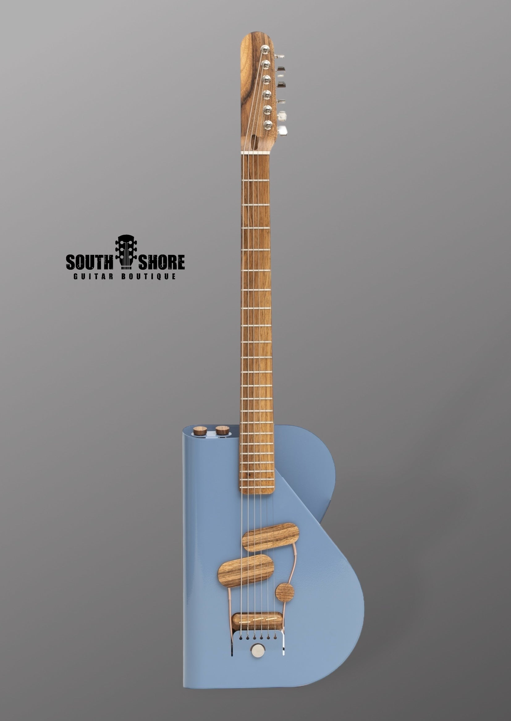 The Orbit is a long 28.5” scale Baritone Guitar with freely moving magnetic pickups. The body is made from durable sheet metal and the pickups slide up and down so that you can place them in any position you please. Place the two pickups close to each other for a Strat like tone or far apart for your typical two pickup electric guitar tone. You can even split the strings, having the neck pup only picking up the three treble strings and the bridge pup picking up only the three bass strings. There’s truly an infinite amount of possibilities.