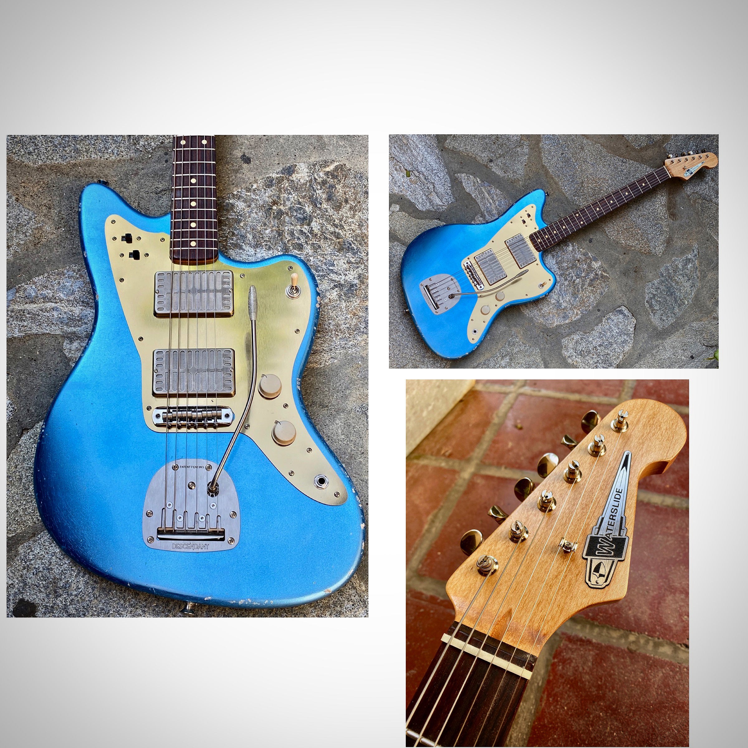 Here's one incredible Waterslide Offset Coodercaster in Copper Metallic with many beautiful custom features, like the Mastery Vibrato with handmade switch-tip; which melds so well with the overall aesthetic/look of this guitar. It has a particularly interesting vibe with the anodized silver guard and Mojo UK Dual Foil Pickups with Copper Foil mesh.