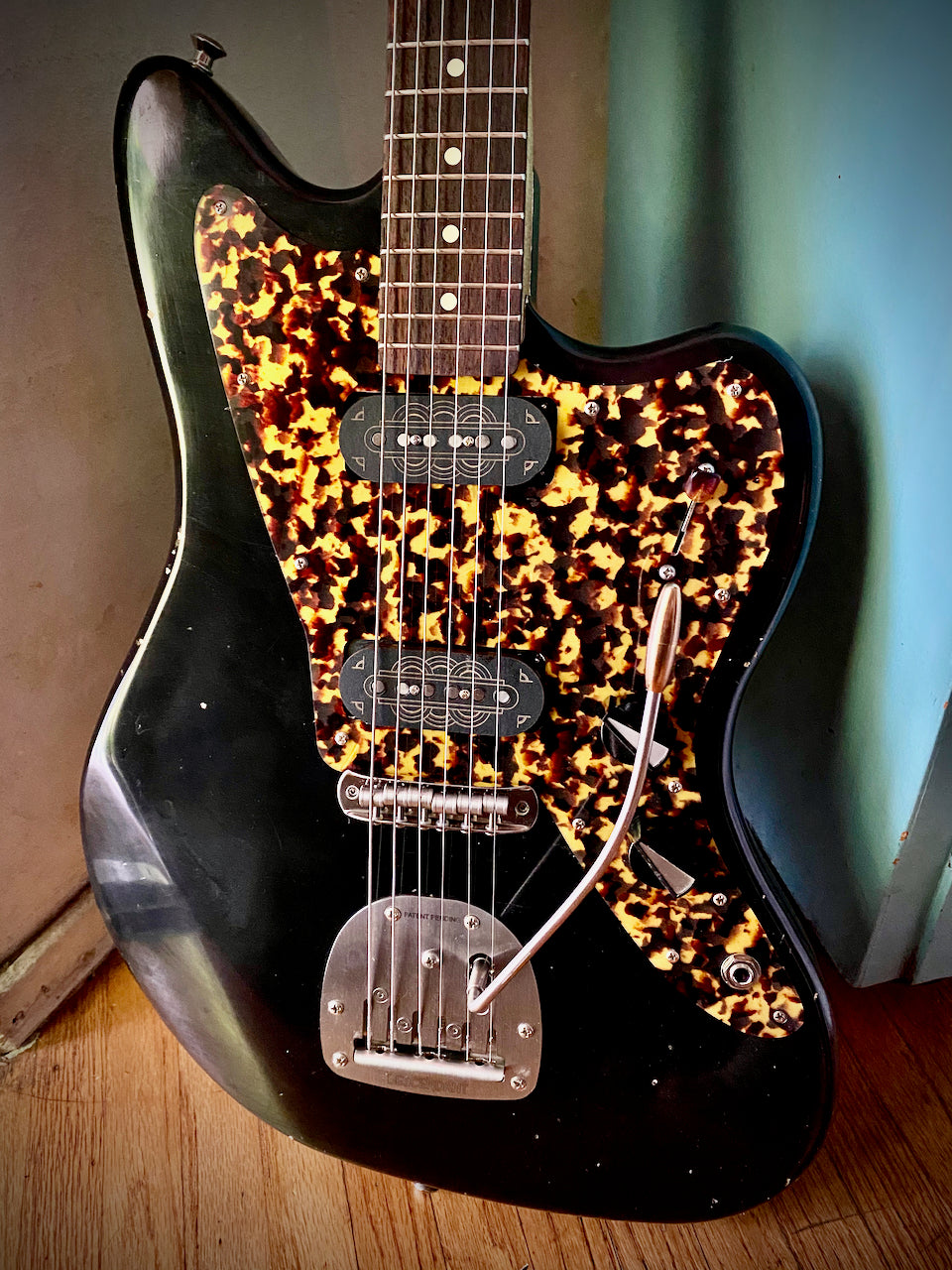 FYI: The first grouping of pictures look the most like the way this guitars finish appears in person. Though it changes with different lighting as it is a metallic color. Here's one beautiful Offset from Waterslide Guitars with manyincredible features, like the New Descendant Vibrato with ahandmade switch-tip; which melds so well with the overall aestheticĀ of thisguitar and matches the great looking gold guard to. The Descendant Vibrato is one of the greatest improvementsĀ to Leo Fenders original design in ages. The strings go beneath the metal plate to achieve a much larger break-angle than all other vintage and modern designs. This means more sustain and no more falling out of the saddles while playing.Ā This great Waterslide Offset sports two Mojo UK Dual-Foil pickups in silver; which are individually split-tableĀ via the topslide switches. Everything from Tele spank to full fat dual Humbucker tone with added clarity can be achieved. This guitar just oozes the word cool. Just look at the realistic checking to the lightly applied Lake Placid Blue Metallic finish. The Chunky V neck profile is to die for. The necks finish feels nice and worn in like a true vintage guitar. Get this one while its still here!! Waterslide Offset Lake Placid Blue w/ Dual Foil Pickups & Descendant Vibrato Specs