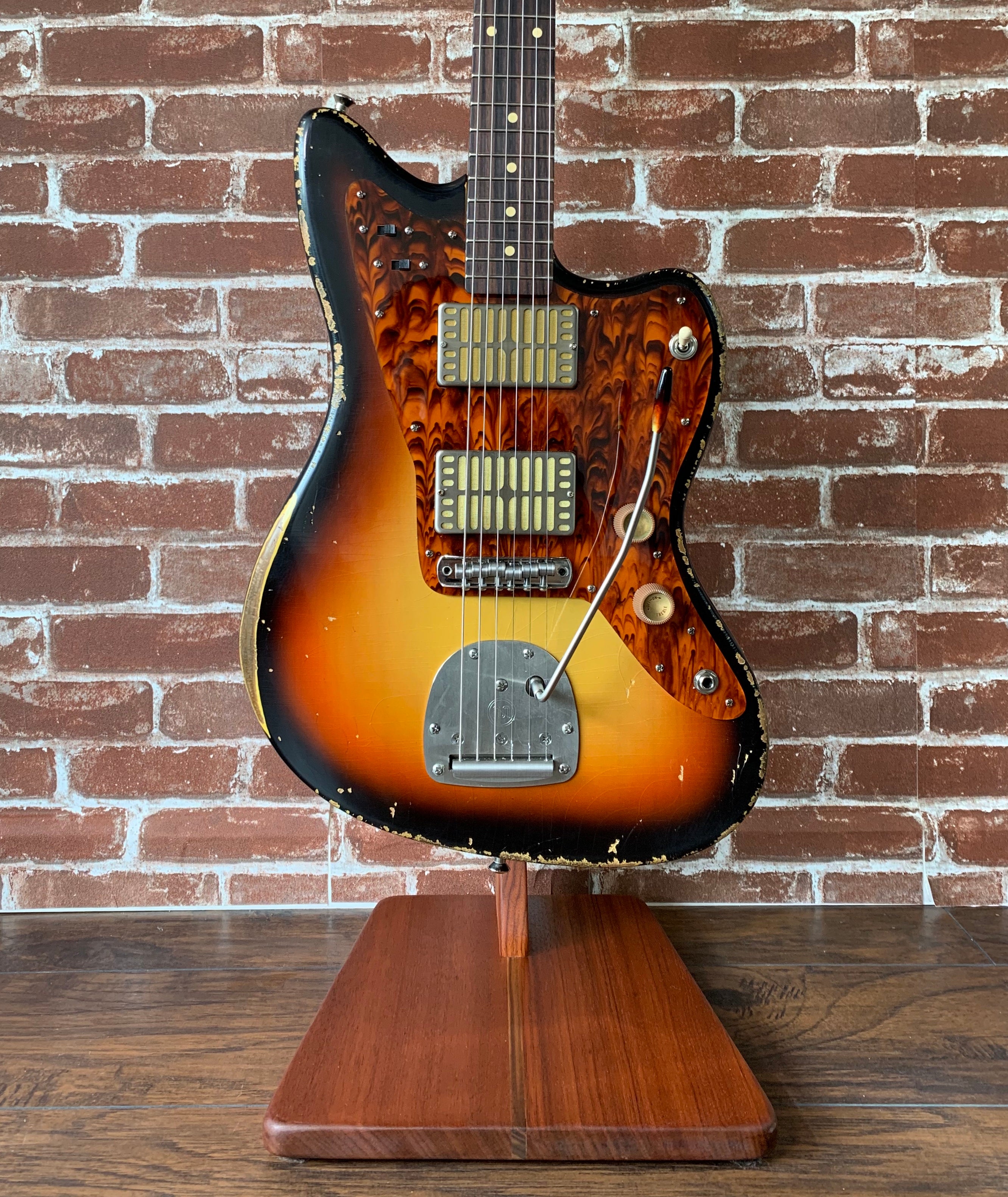 Available is a very customized Waterslide Offset. This guitar features an Aged Black all Nitro finish with a leopard celluloid pickguard and Mojo UK Decosonic Pickups. To top it off this build also features the most responsive offset vibrato unit on the market today, the Descendant Vibrato by Swope Guitars. This unit incorporates notches in the base-plate, where the strings go below the unit for ultimate downward pressure and the perfect break-angle for an offset guitar; where a shallow breaks angle at the bridge has always been an issue. The Decosonic Pickups are a unique blend of vintage Fullerton style twang (think JM or Tele) mixed with the high fidelity of a Dynasonic Pickup, found in many early Gretsch and Guild guitars of the 50's such as the Gretsch Duo Jet, White Falcon & Guild Duane Eddy model. They are crystal clear with lots of bite and snap, with a unique lapsteel like quality in the bridge position but fatter. Some of the best pups we've played in a Waterslide to date. The chunky full C neck profile mixed with a 12" radius makes this instrument a joy to play both flat picked or fingerstyle due to the wider 1 11/16" nut width. The guitar has some beautiful handmade celluloid appointments and a very responsive offset Descendant vibrato, paired with a steel saddle Staytrem bridge.