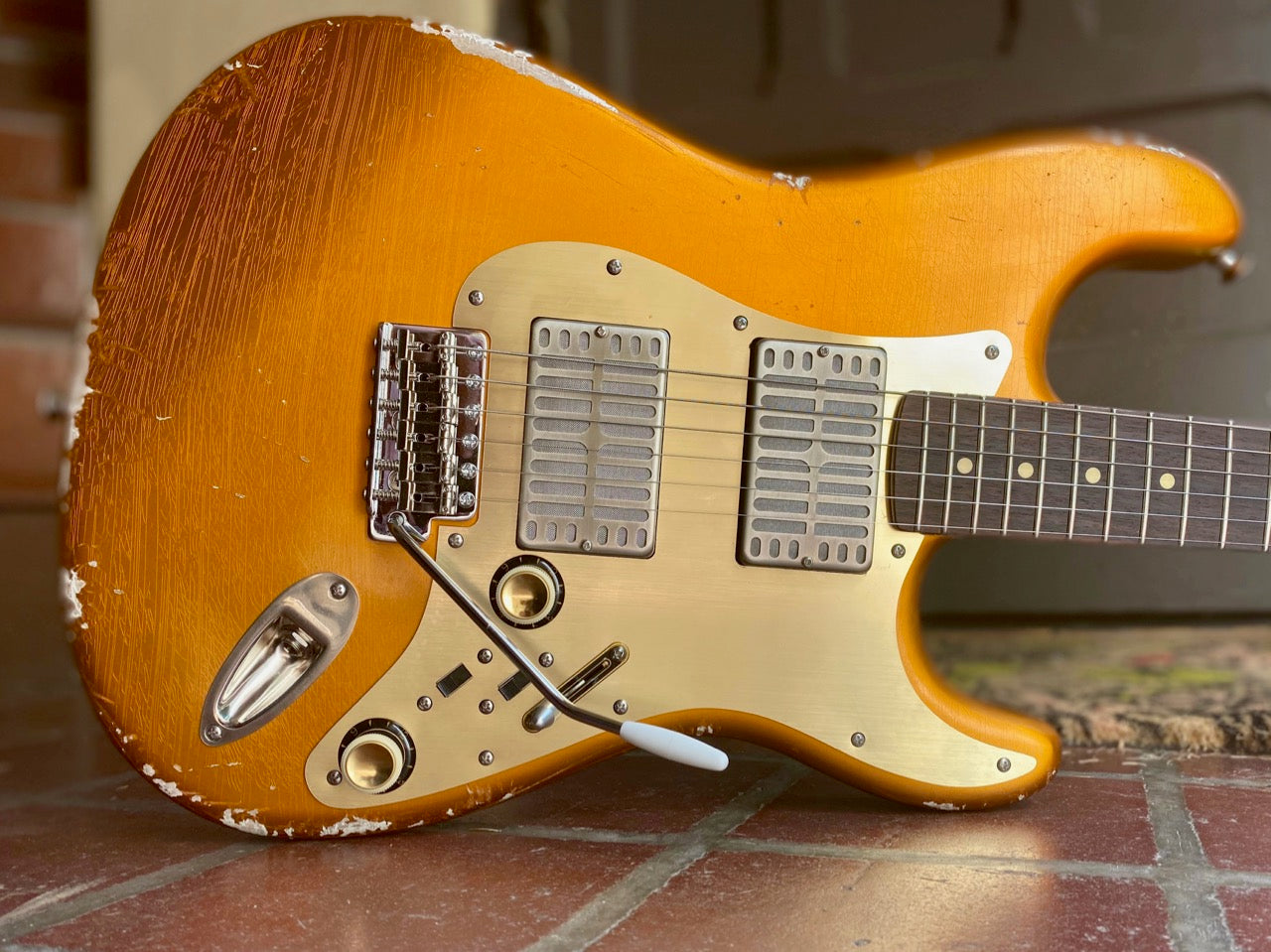 A beautiful and lively offering from Waterslide Guitars, featuring a Lapsteel bridge pickup with Strat Vibrato and a Teisco-Spec Gold Foil Pickup. This one came out incredibly well and plays beautifully. This guitar excels at slide playing, but is so versatile for all styles of music. The bridge pickup is like a Tele pickup on steroids with outrageous sustain and clarity, while the Mojo Pickups UK neck Gold-Foil pickup, is the pinnacle of great Gold-Foil tone. Warm with and edgy crispness to it, that only a master pickup winder can achieve. The bright 1-ply fire-stripe celluloid guard on the red finish is extremely pleasing to the eye. Playability is excellent and for those who like to do tone and volume swells; the controls are in just the perfect positions. Don't let this one pass you by. Customer wait list for new Waterslide orders is pretty long right now. This one is complete and ready to be played for a lifetime.