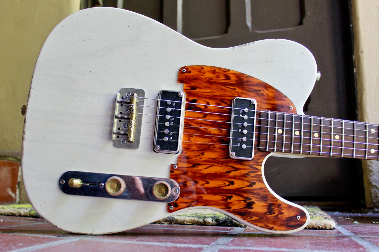 A beautiful and lively Coodercaster from Waterslide Guitars, featuring a Lapsteel bridge pickup with hardtail bridge and DeArmond spec Gold-Foil neck pickup. This one came out incredibly well and plays beautifully. This guitar excels at slide playing, but is so versatile for all styles of music. The bridge pickup is like a Tele pickup on steroids with outrageous sustain and clarity, while the Mojo Pickups UK neck Gold-Foil pickup, is the pinnacle of great Gold-Foil tone. Warm with an edgy crispness to it, that only a master pickup winder can achieve. The bright 1-ply Leopard Celluloid pickguard is extremely pleasing to the eye on the Aged Sonic Blue finish. Playability is excellent and for those who like to do tone and volume swells; the controls are in just the perfect positions. Don't let this one pass you by. Comes in a hard shell case. WaterslideGuitars S-Style Coodercaster
