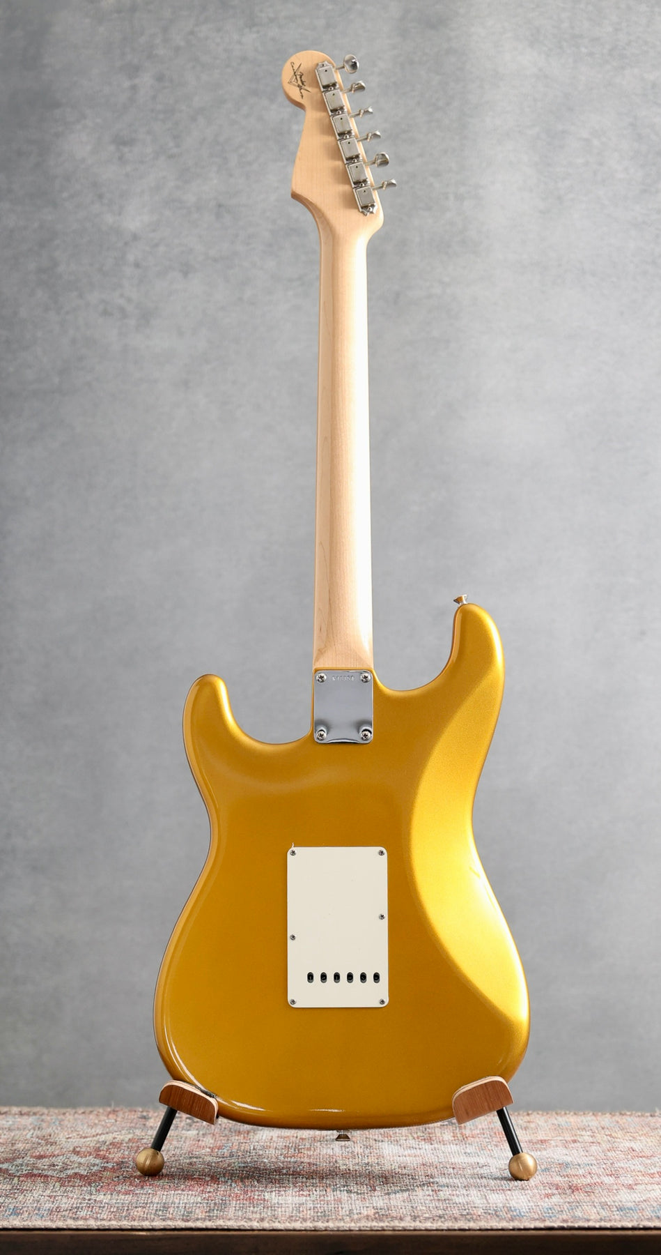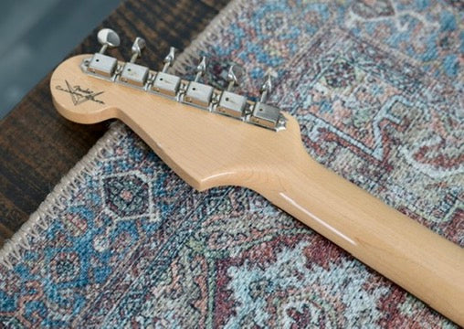 The alder body is finished in a striking Aztec Gold, giving it a bold vintage-meets-custom look that really stands out under the lights. Three Custom ’60s-style single-coil pickups deliver classic Strat tones with clarity and chime, while the RW/RP middle pickup keeps the in-between positions quiet and usable even with gain. An American Vintage–style synchronized tremolo and vintage-style tuners round out the traditional feel.