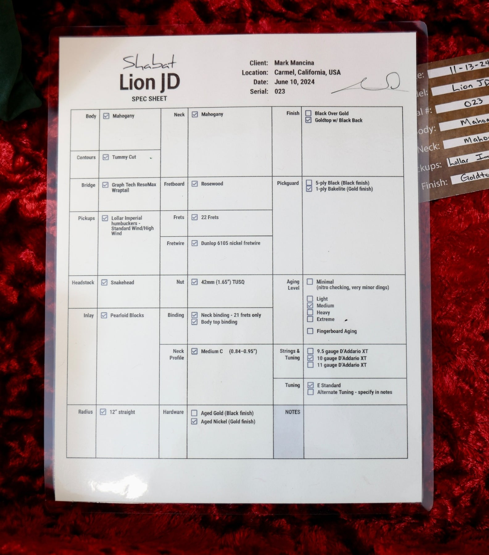This Shabat Guitars Lion JD is built around a 24 3/4” scale length, offering a familiar, slightly slinkier feel that encourages expressive, fluid playing. Finished in AGD Gold with a contrasting black back, it balances classic elegance with modern boutique refinement, letting the craftsmanship speak without excess flash.