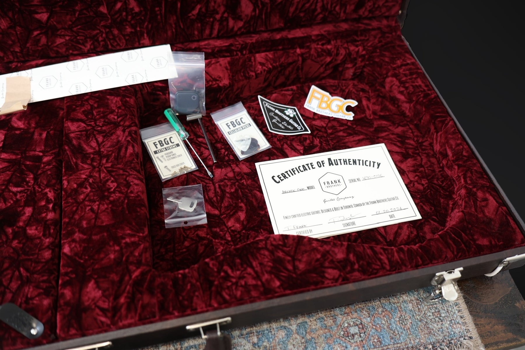 This example is currently fitted with Castedosa TS Hum-Buckers, wound by Carlos Lopez and Stephanie Lopez. These are a high-quality aftermarket upgrade that pairs beautifully with the guitar’s construction, offering rich harmonic content, clarity, and touch sensitivity across a wide dynamic range. The guitar was originally built with Lollar pickups, and the Castedosa set represents a thoughtful tonal alternative rather than a replacement of lesser quality.