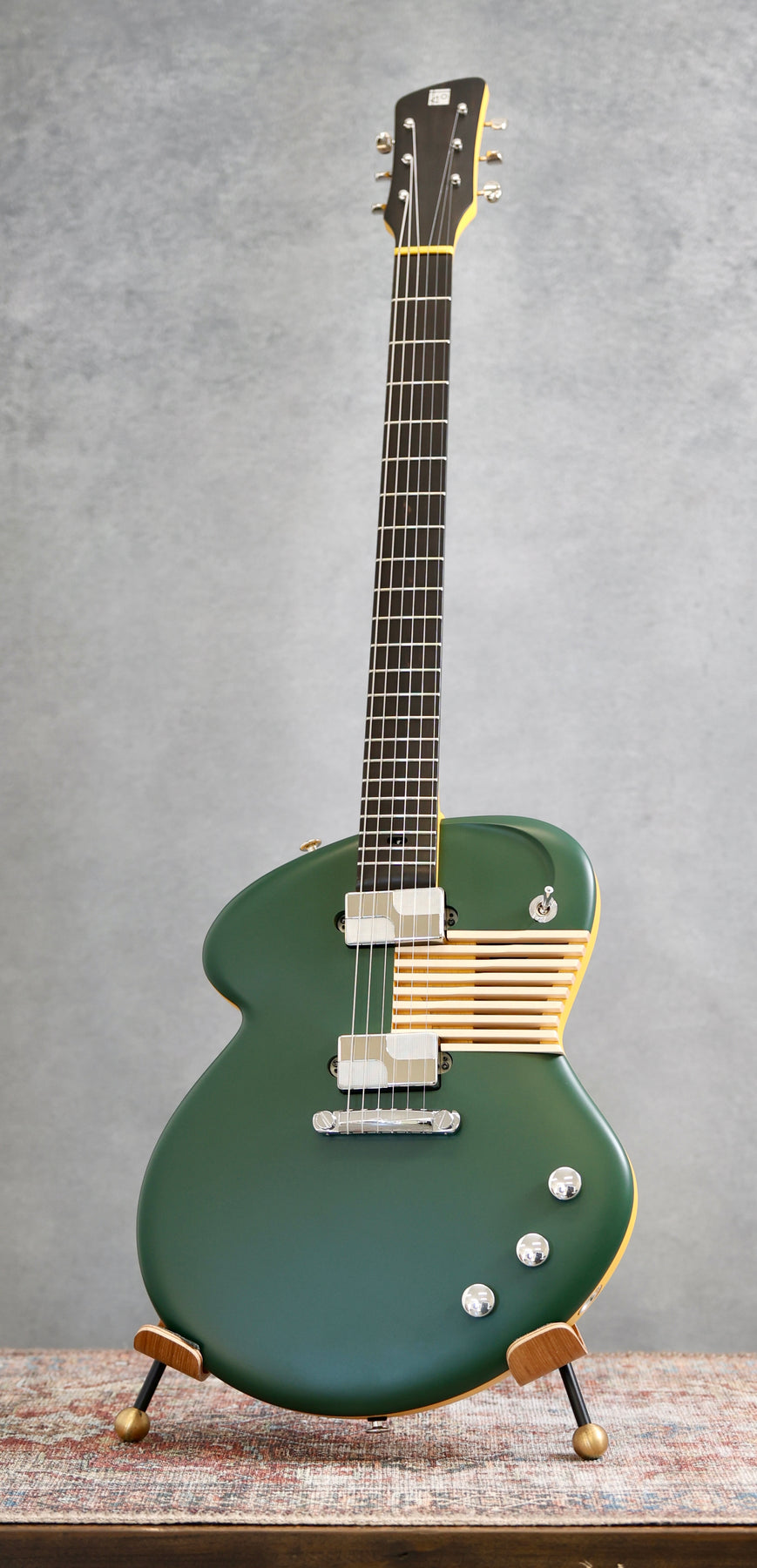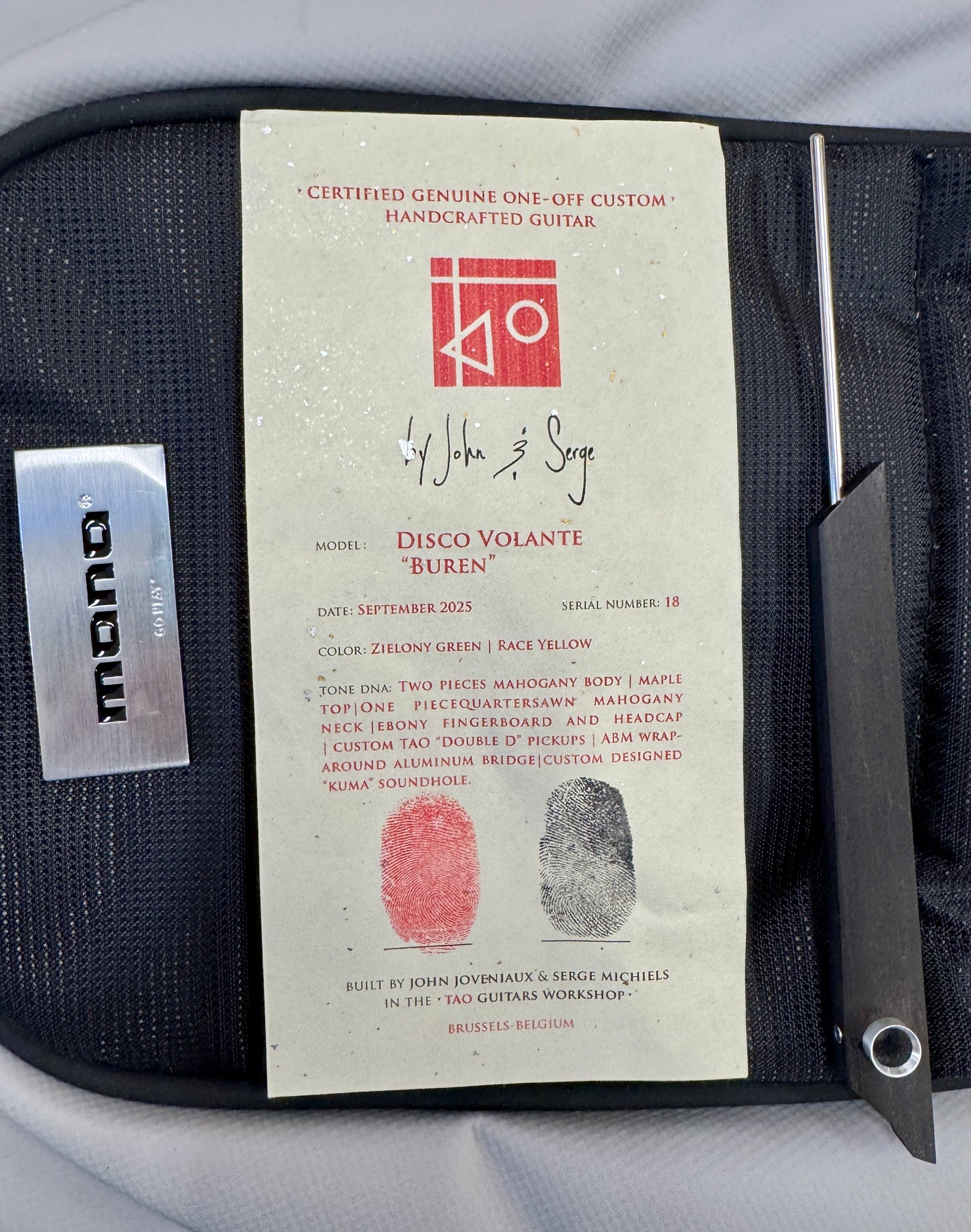This Disco Volante “Buren” ships with its original certificate of authenticity and custom truss rod tool and stands as a beautifully executed, design-driven instrument from one of the most thoughtful boutique builders working today.