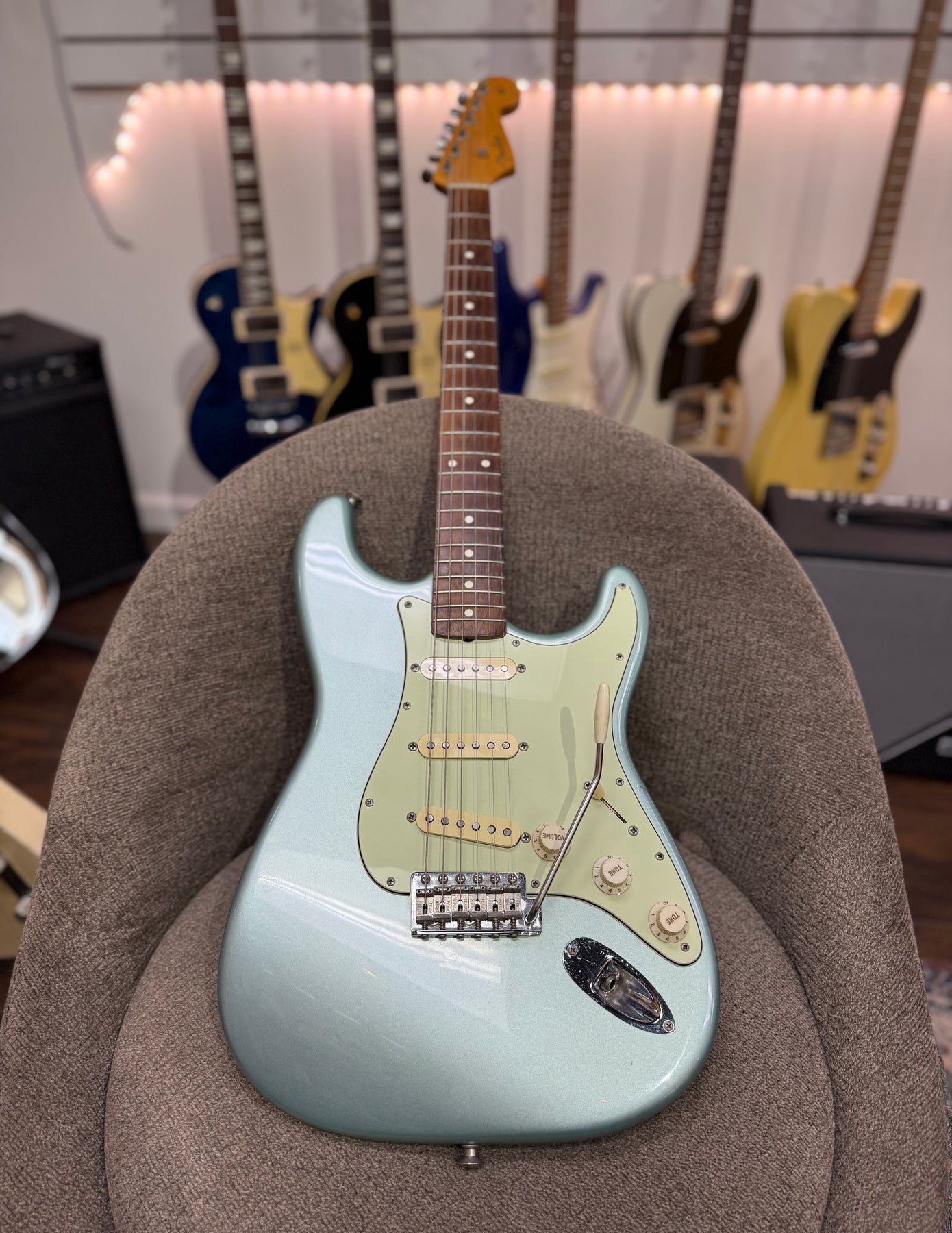 Finished in a beautifully aged Ice Blue Metallic, this 1962 Reproduction Strat is Masterbuilt by Yasuhiko Iwanade during the very early days of the Fender Custom Shop. Consider it a "pre-Historic" Custom Shop model before Fender began producing reissues.
