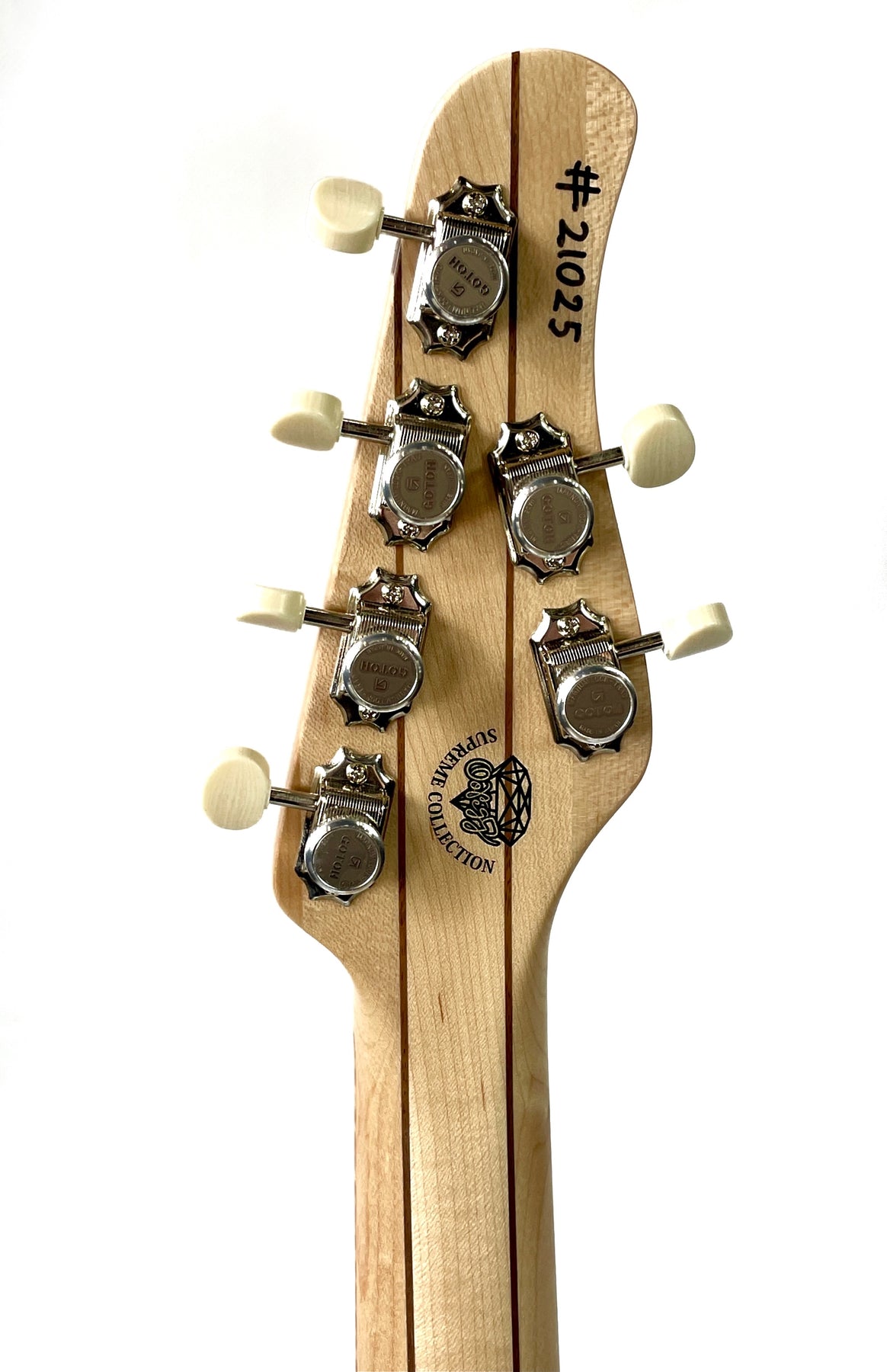 This guitar also has a comfortable and beautiful 5-ply neck made of Maple and American Walnut adding further stability and stiffness. You'll also notice the unique neck plate area, that allows you to have easy access to the higher registers of the fingerboard. This instrument is also light weight and very well balanced by design at only 7lbs 6oz