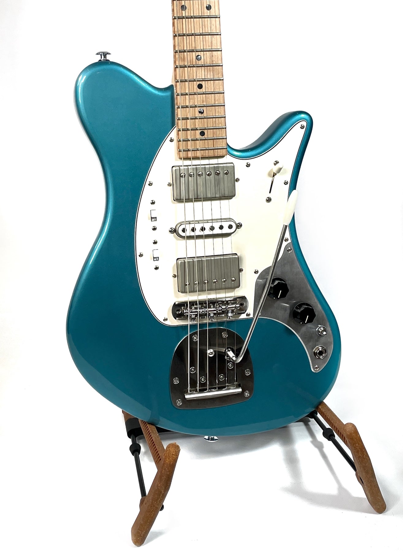 This particular Mark I features three pickups by Magneto Design Lab in North Carolina; 2 Humbuckers and a mildly hot Single-Coil middle pickup. This guitar is super quiet in all positions. You also have some of the best hardware around, a bridge by Halon in Greece and a vibrato by Descendant in the US. This pairing makes for a responsive, touch sensitive experience without the downfall of falling out of the bridge's saddles, like on many vintage offset guitars of yesteryear. This is due to the grooved bridge design and the grooves in the Descendant that allow the strings to go beneath it's plate for a larger break angle than vintage-style units. See pics.
